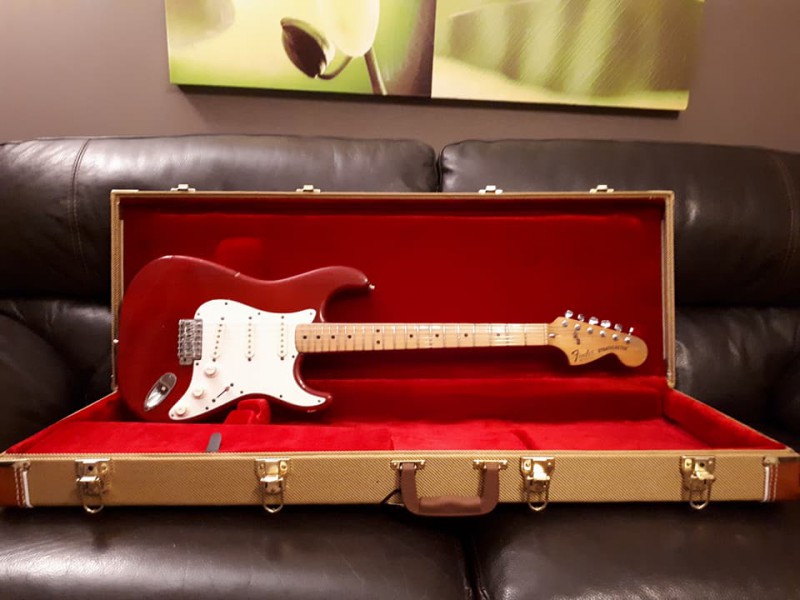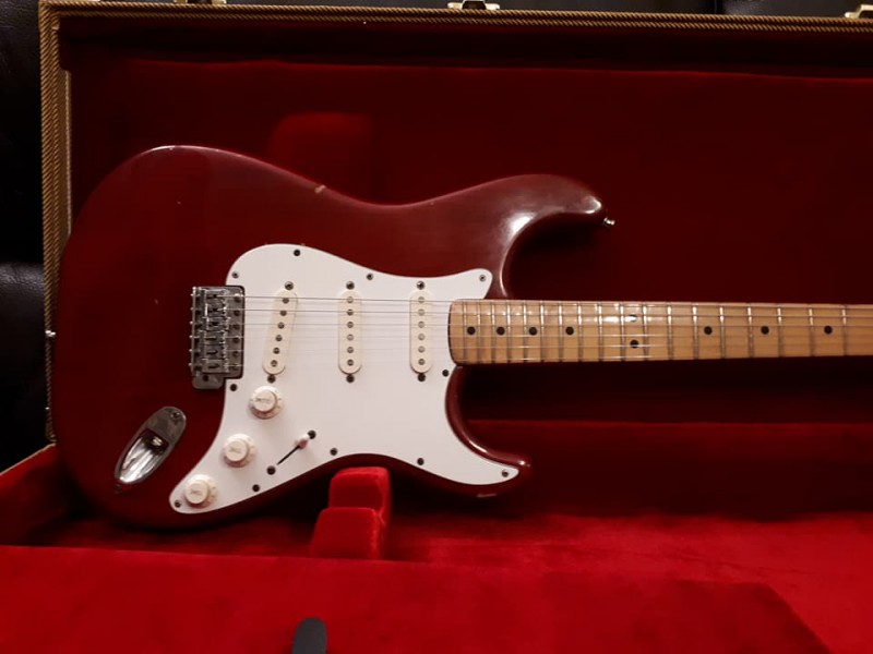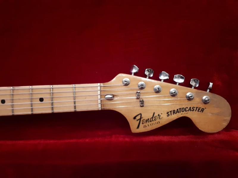 Seul le pickguard blanc n'est pas d'origine, mais j'ai l'original noire de 1979 (un peu retouché au niveau chevalet) avec le report du numéro de série de la guitare dessous comme cela se faisait à l'époque. A noté aussi qu'il manque la barre de vibrato et la plaque arrière.
