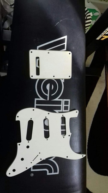 Set complet pickguard + trémolo coder blanc 3 plis pour stratocaster. En bon état mais un peu jauni avec le temps.