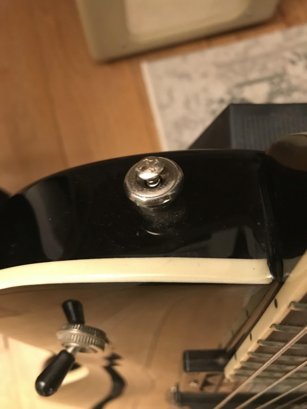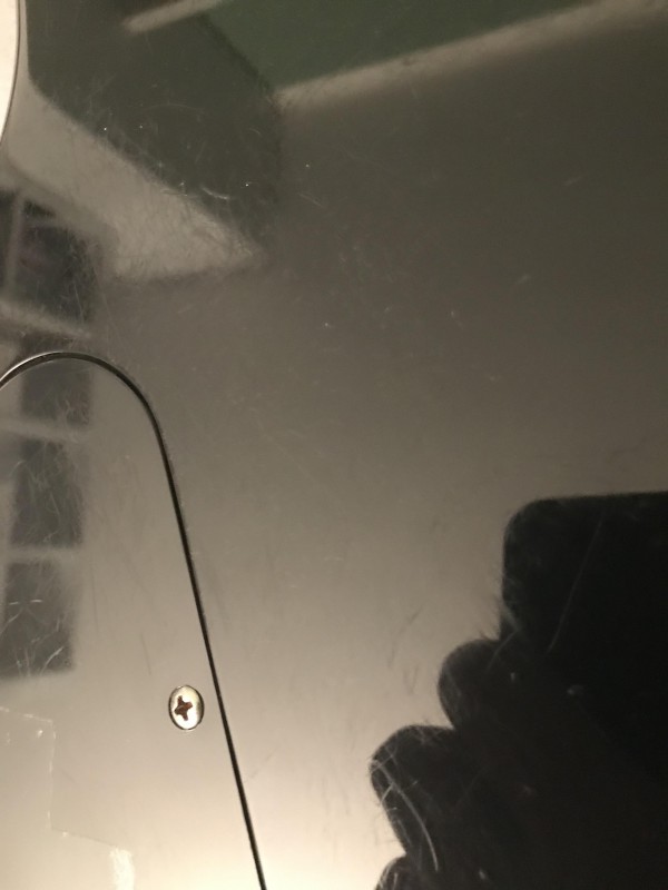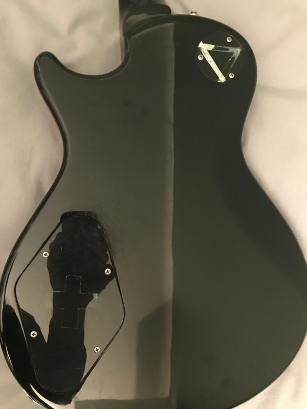 Elle est en bon état général, avec 2-3 traces d'usure (cf. photos) : un potard manquant, quelques rayures diffuses au dos, deux-trois traces d'adhésif sur les plaques, et les vis pour la sangle ont un peu de jeu. En dehors de ça, toujours aussi bon son, claquant et punchy.
