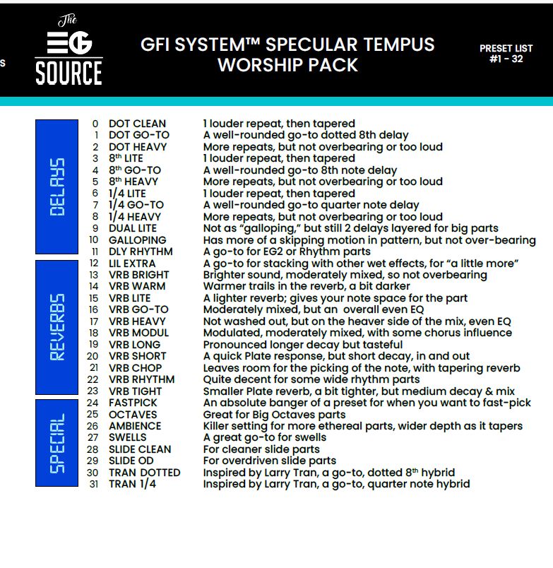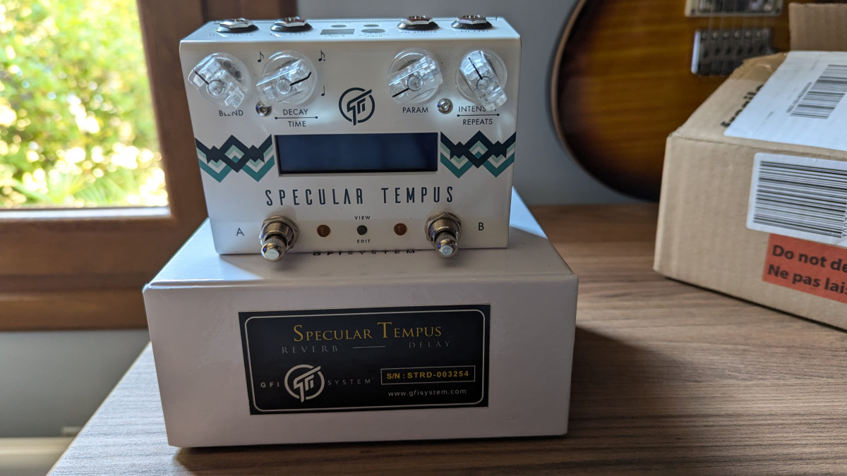 Je vends ma pédale Reverb/Delay de chez GFI la Specular Tempus que je livre avec 32 presets supplémentaires (voir liste en photo).