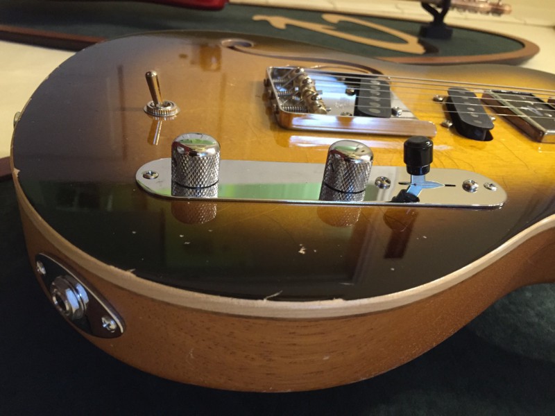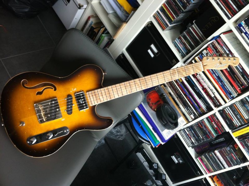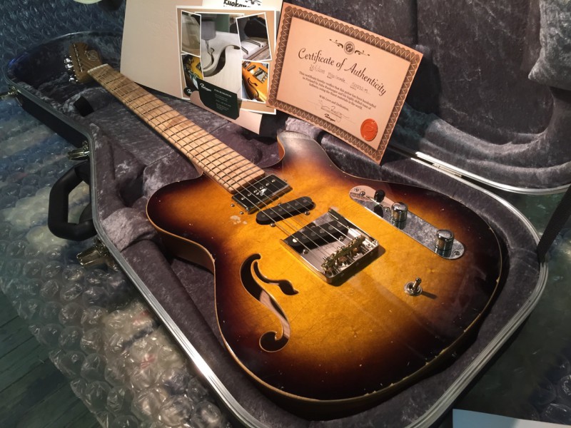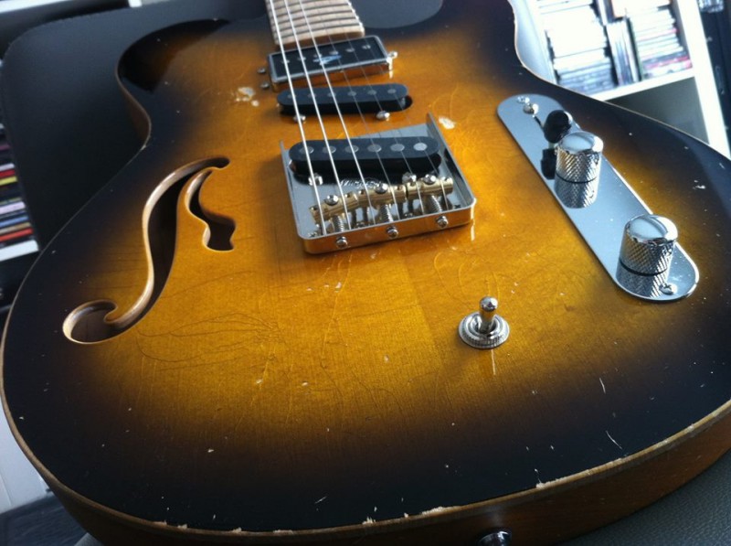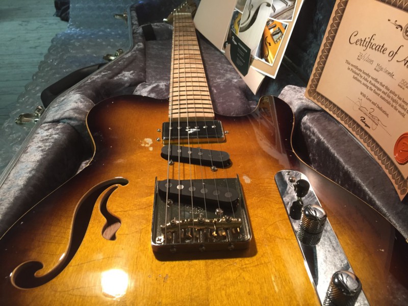 Elle est unique car c’est un modèle MOJO (Hollowbody comme le modèle Grande) et elle a l’électronique du modèle KING (micros en série et parallèle pour des sons de type humbucker), d’autres options ont été sélectionnées, comme un superbe plain top (option payante) ainsi qu’une finition relic (qui n’est même pas au catalogue).