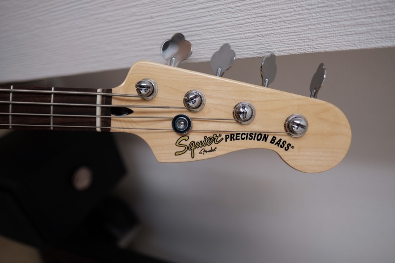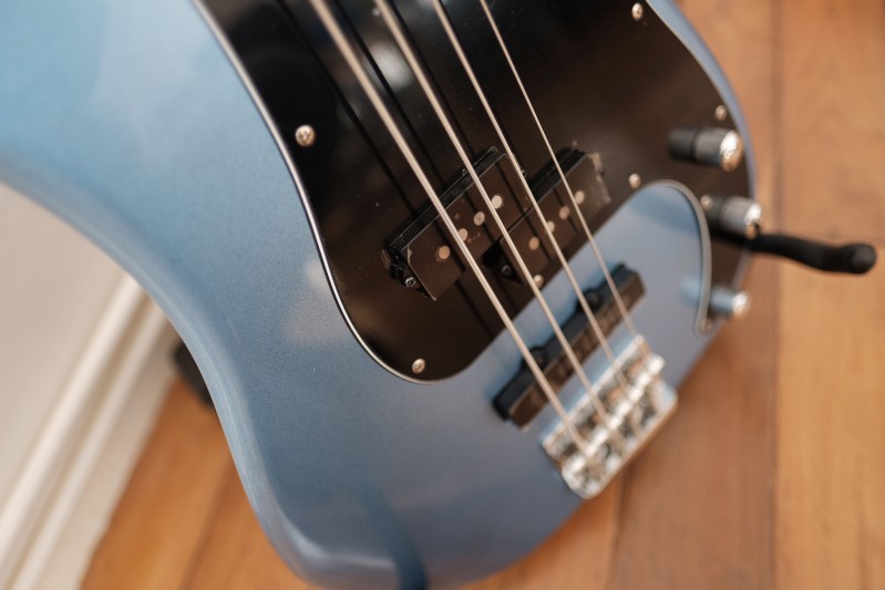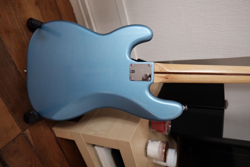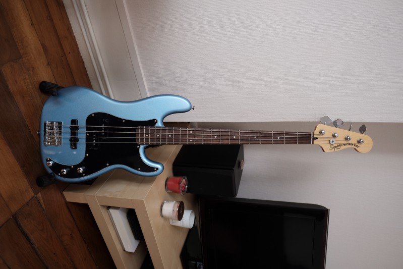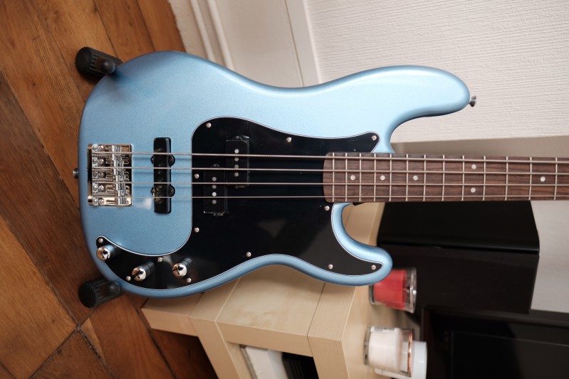 Je vends ma basse Squier Vintage Modified Precision Bass PJ, de couleur bleue.