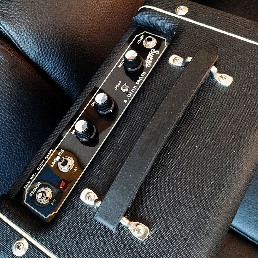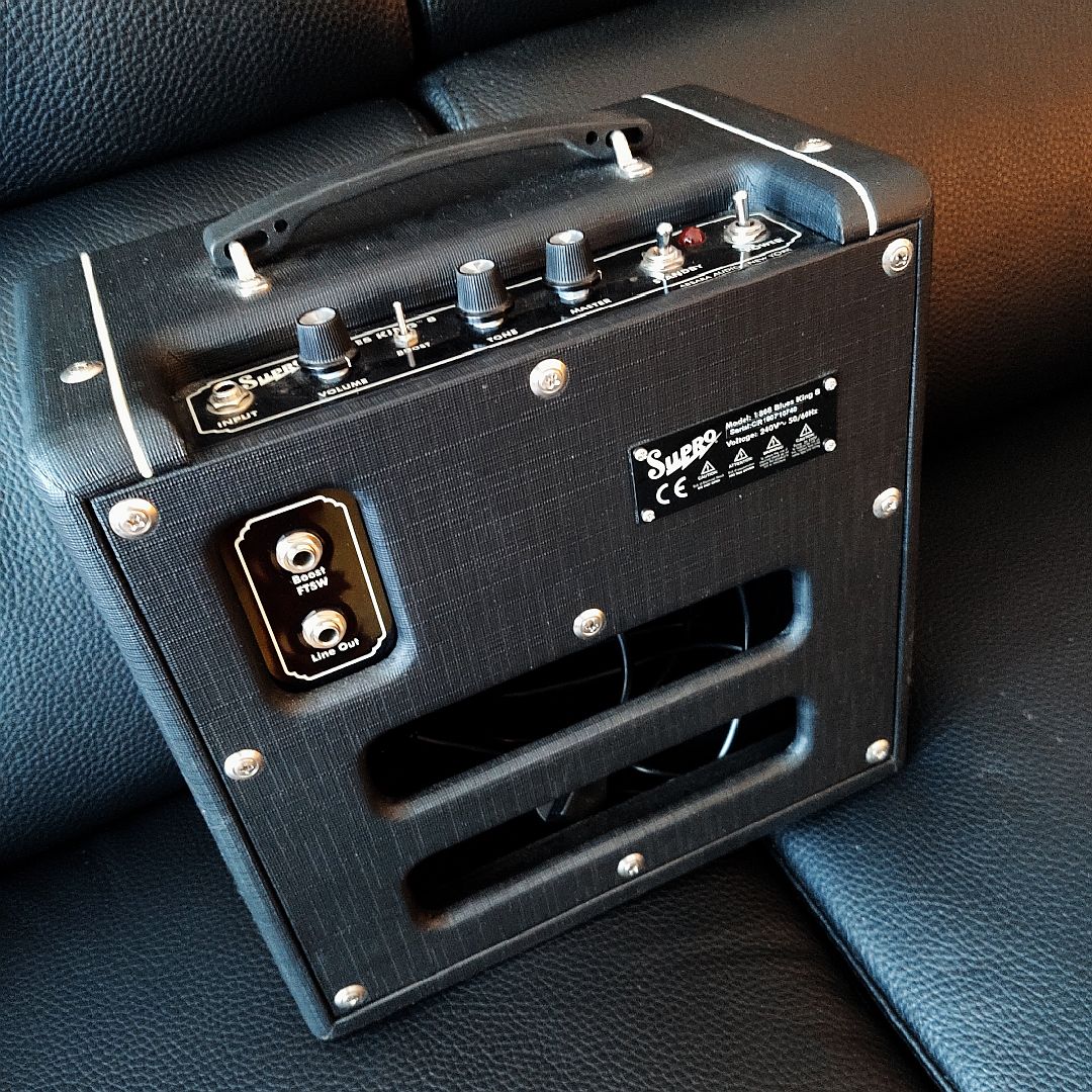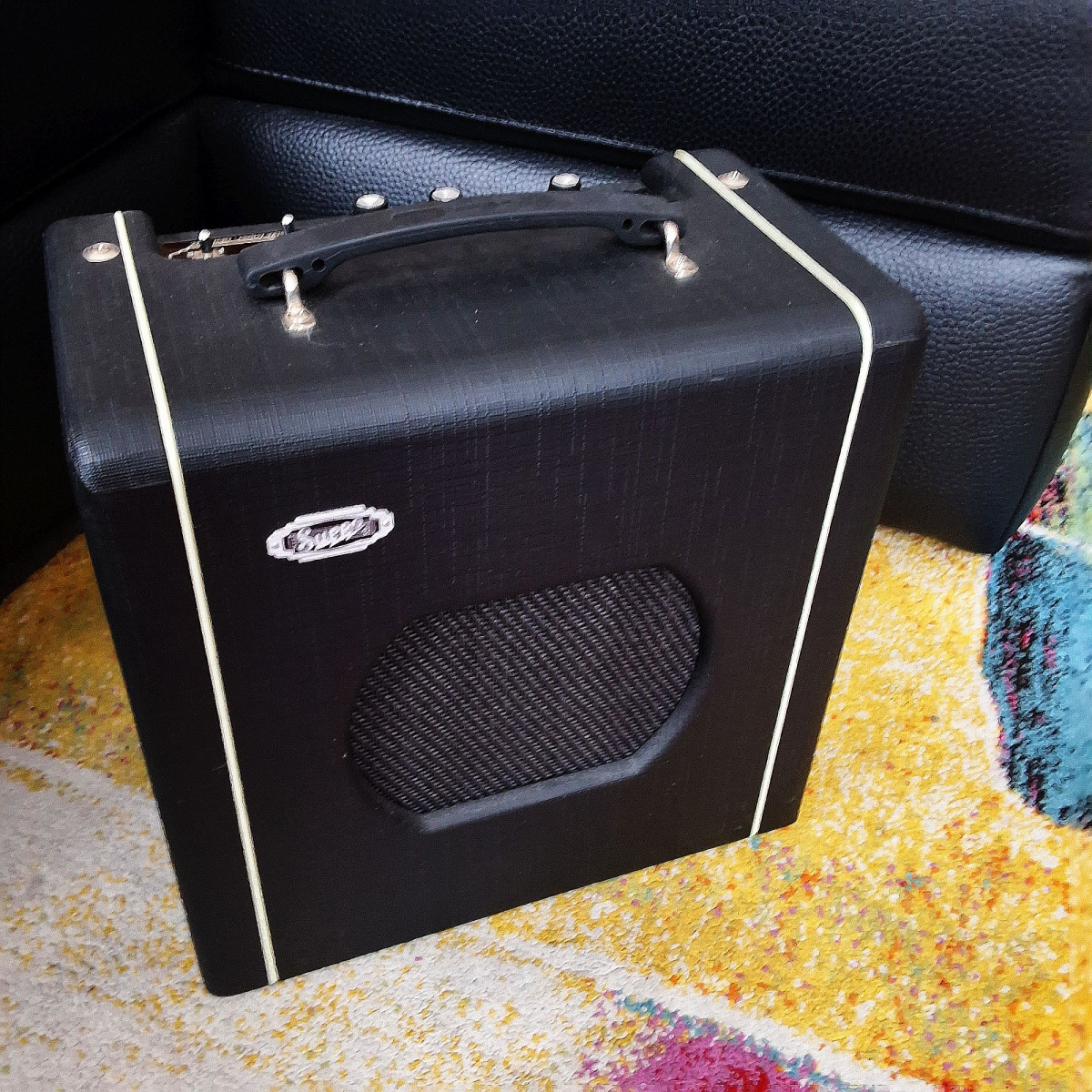 SUPRO BLUES KING 8" - 1W à lampe, idéal pour se la jouer blues des marécages sur le rocking chair devant le porche - ou plus prosaïquement en appart' ou chambre avec un poster des bayous de Louisiane ou/et une Corona fraîche. Master volume et HP de 8", donc très pratique mais si on veut faire un peu de barouf, son unique Watt sait se faire entendre!