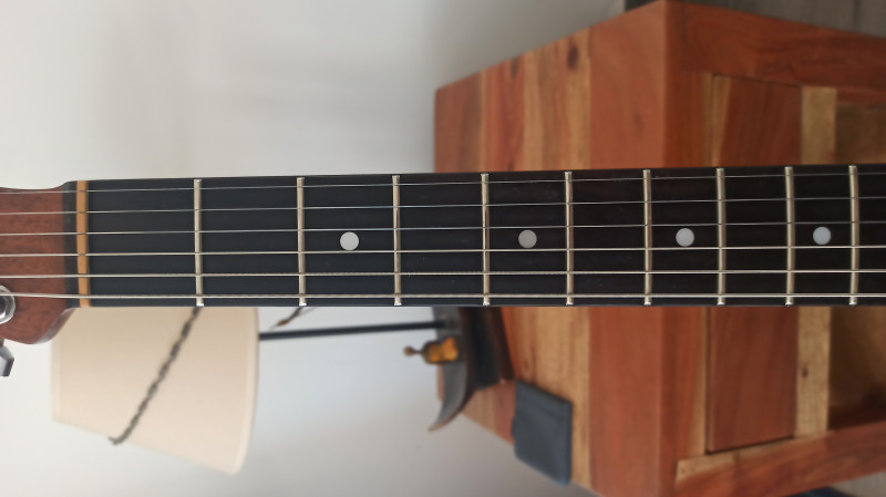 Le manche Musicraft (huilé) sur mesure acajou touche ébène, radius 12, sillet Graphtech, 22c, frettes Dunlop 6100, 1/11/16, mécaniques Gotoh.
