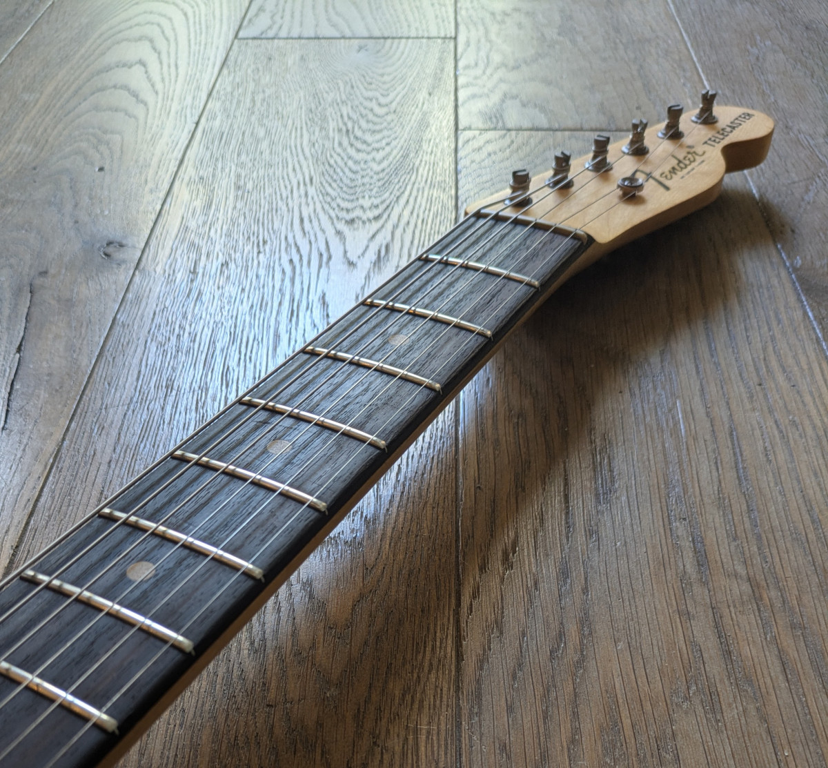 Le manche est probablement un vieux AllPart bien costaud, et a été récemment refretté avec des Jescar 0.104 x 0.47 puis planifié. J'ai chanfreiné le bord de touche et des frettes. Le manche se loge parfaitement dans le creux de la main.