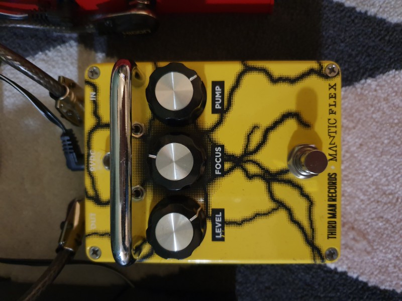 Third Man Record Mantic Flex : c'est une édition limitée dans cette couleur jaune. Pédale synth fuzz en quelque sorte, qui peut sortir des sons assez improbables, je vous laisse voir ça sur Youtube. Elle s'entend pas mal sur le dernier album des Raconteurs et de Jack White. Vendue sans sa boite.