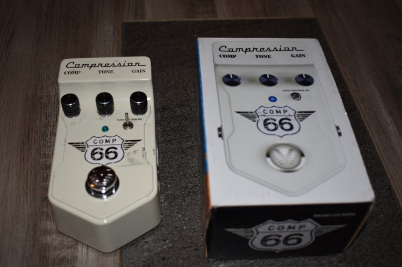 Pédale de compression de Visual Sound Comp66. Cette pédale délivre un son assez atypique, elle rajoute un son très chaud grâce notamment au potard de gain. On peut activer ou désactiver le potard Tone grâce à un switch. On peut également activer/désactiver un noise gate, il suffit pour cela de démonter les 4 vis qui se trouvent sous la pédale et d'activer le switch. Elle possède également un buffer de qualité comme toutes les Visual Sound.