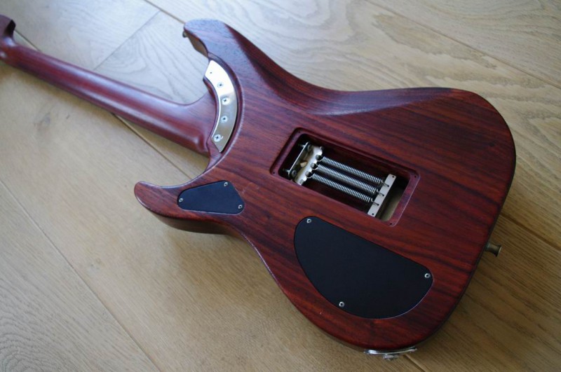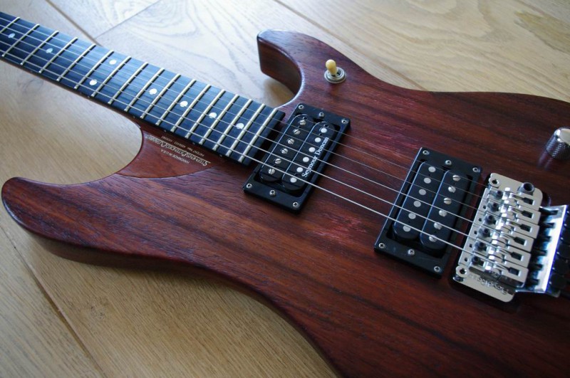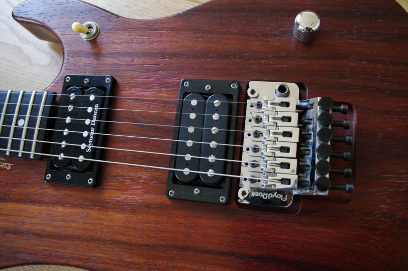 Floyd Rose Original qui ne fonctionne qu’en « dive only » puisque une cale en bois sert à bloquer le Floyd. Le montage avait été confié aux soins de