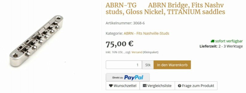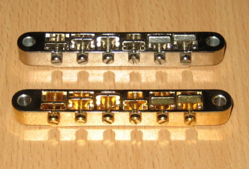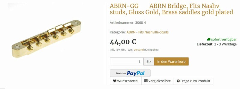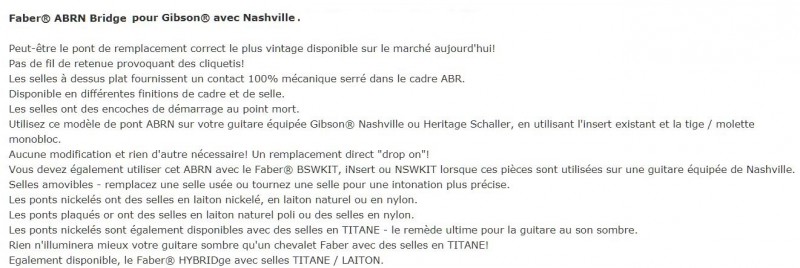 Je vends 2 bridges Faber® ABRN, ils se montent à la place du "gros" Nashville sans aucune modification. L' un est chromé et l' autre est gold.