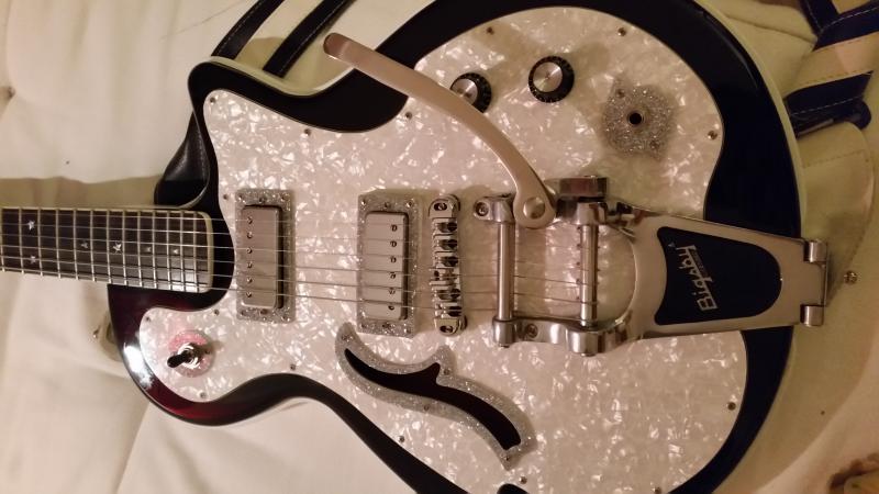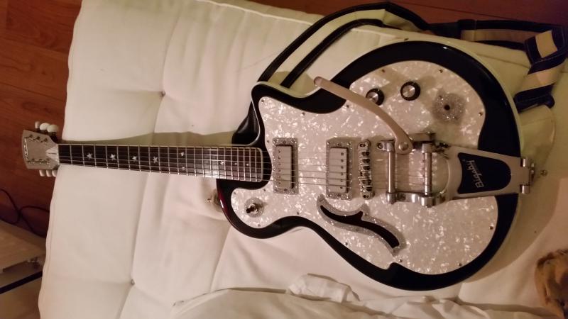 Guitare hollowbody avec vibrato bigsby et 2 mini humbuckers (changé pour des Gibson, micros origine dispo), manche vissé, touche ébène.