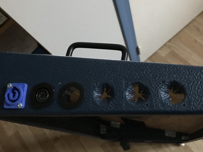 Sur le coté des trous sont pré percés pouvant accueillir des fiches Neutrik (je laisse le powercon et le raccord midi d’origine) Je peux vous donner des fiches Neutrik TRS à souder si vous en avez l’utilité.
