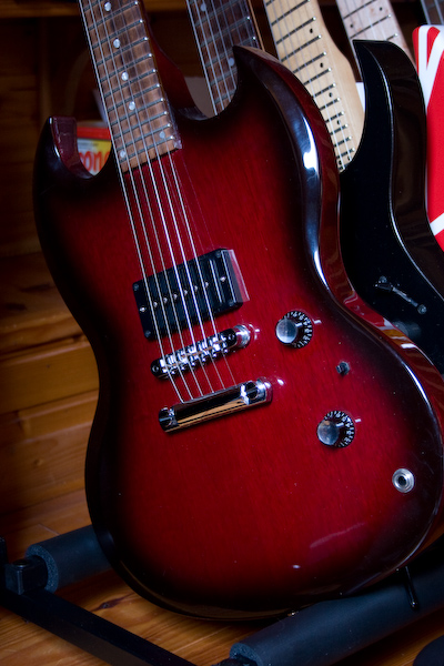 à celà se rajoute une gibson SG-X de 97 (première main, mais grosse player, elle a de bonnes marques d'usure et du temps, notamment sur le manche, mais à part ça sonne très bien), j'ai remplacé le 500T trop "brutal" par un classic 57 zebra, qui lui donne définitivement le son. Note: elle pèse moins qu'un étui ;-) (à vue de nez moins de 3kg) et sonne bougrement à vide