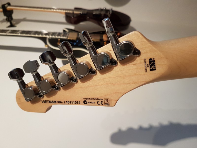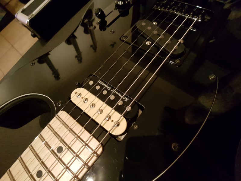 Par contre j’ai trouvé que les micros n’envoyaient pas à la hauteur de mon espérance… Je me suis fait une petite config Bare Knuckles Flat 50’ en bridge avec un petit SH1, j’en ai profité pour remplacer l’électronique douteuse de la bête par du CTS Fender 250K. Par dessus ça on s’installe des mécaniques Gotoh, histoire de vraiment se mettre bien:
