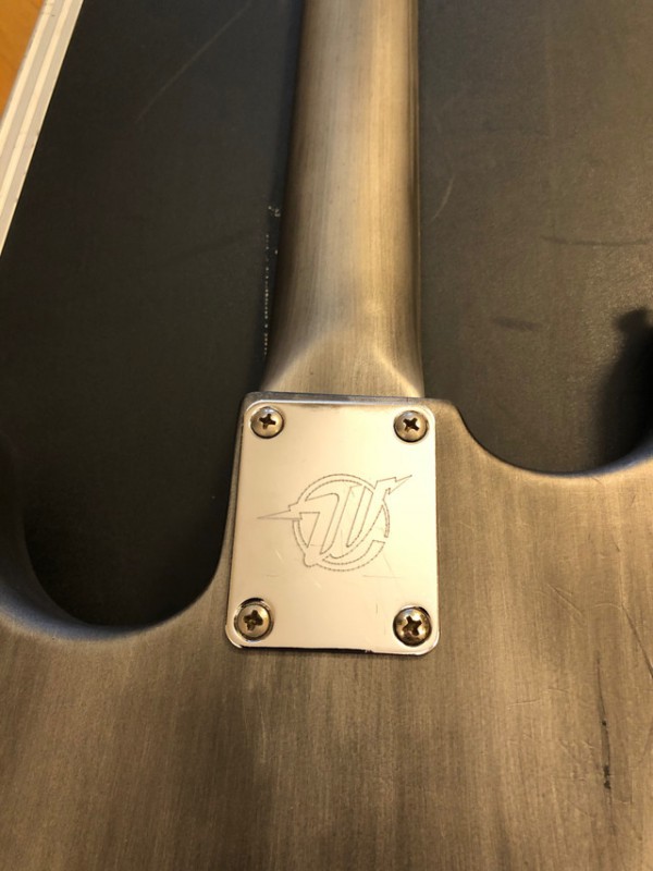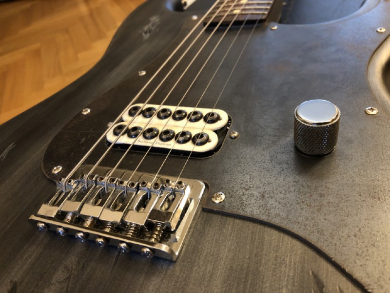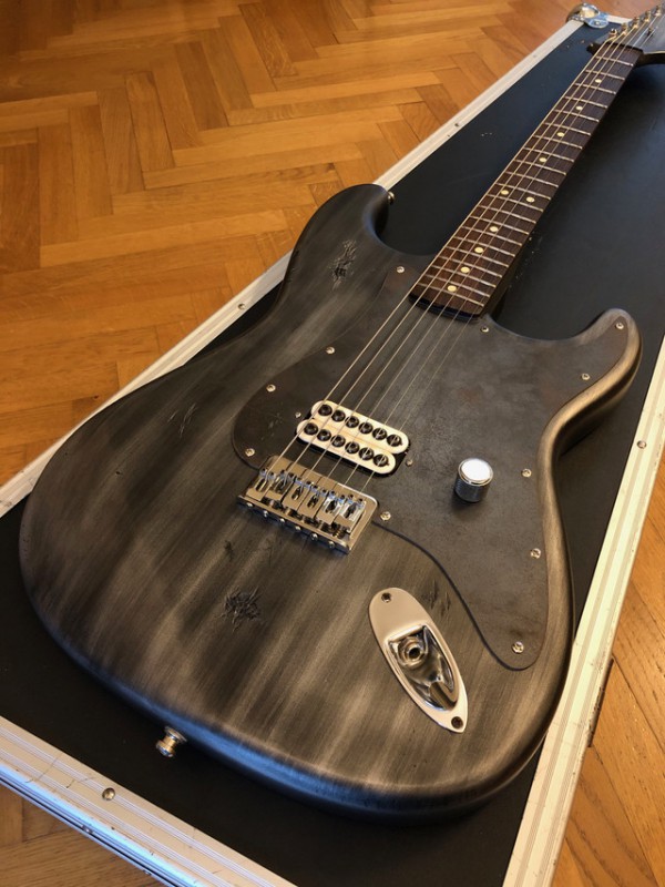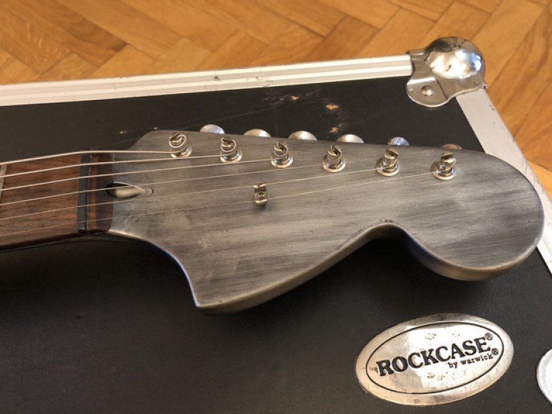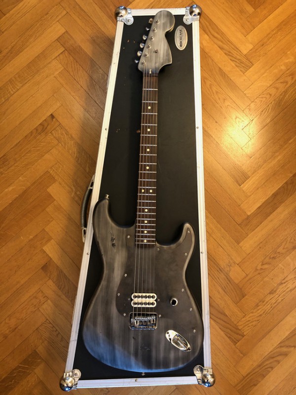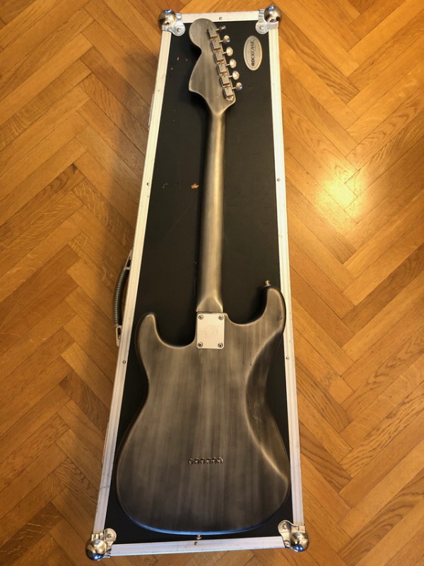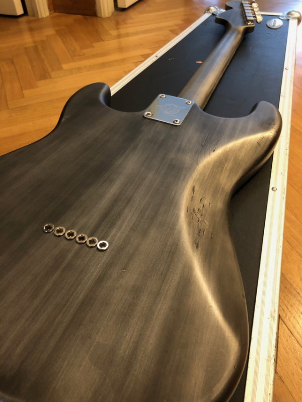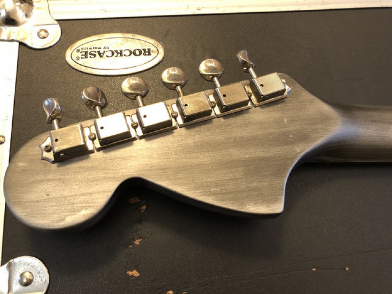 Ils ont repeint pour donner un effet industriel / métallique / destroyed sur tout le corps, l'arrière du manche, et la tête. La plaque arrière a été changée, tout comme le pickguard sur mesure en métal. À l'origine la guitare était couleur "surf green".