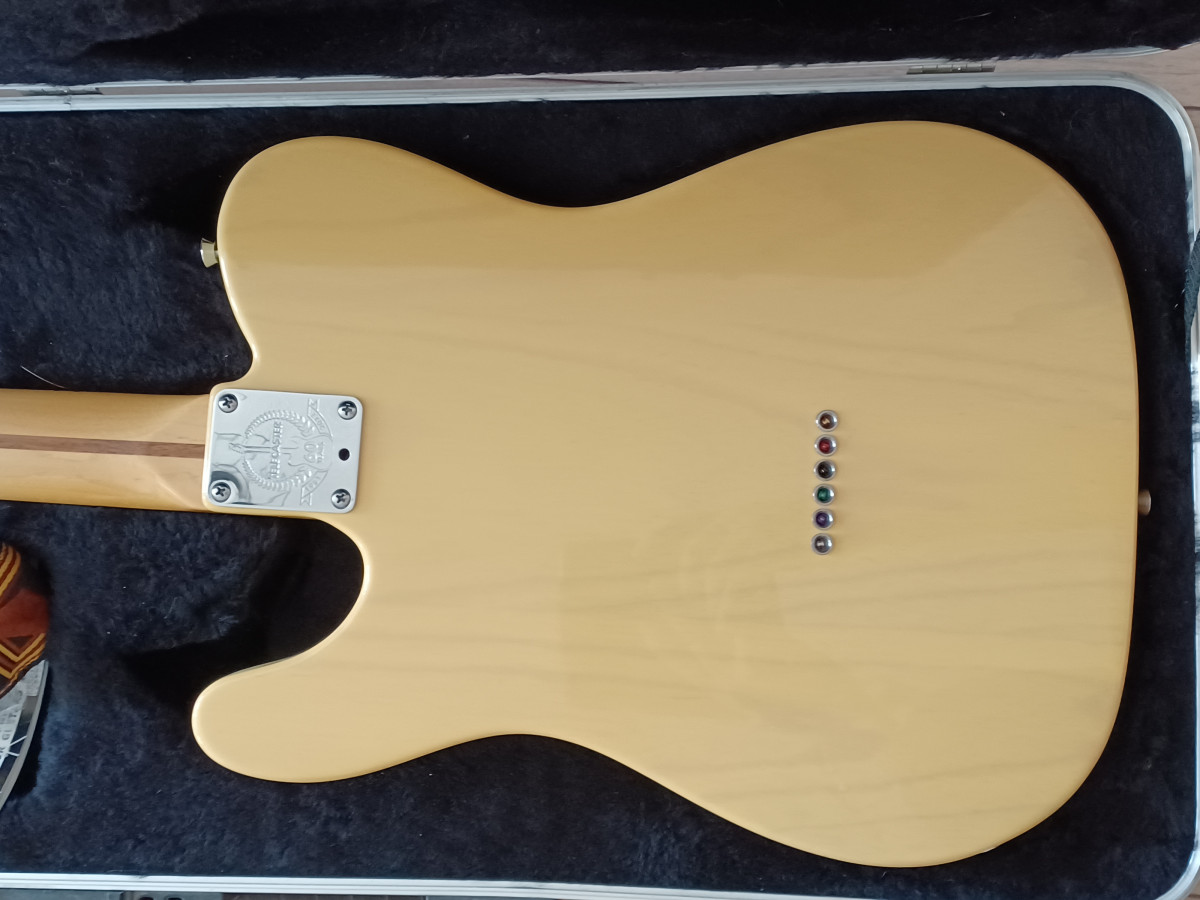 Deux modifications: elle est montée avec un set Tele'55 de chez Tornade MS Pickups (meilleur son de Telecaster en position manche et intermédiaire que j'ai pu entendre) mais je donne avec les micros d'origine. De plus le dos du manche a été légèrement poncé en décembre dernier par une luthière toulousaine (Marine Pacaut), cela le rend plus agréable à jouer, plus "glissant", elle a à cette occasion été réglée et ajustée, montée en 10,5-48 avec une action plutôt basse.
