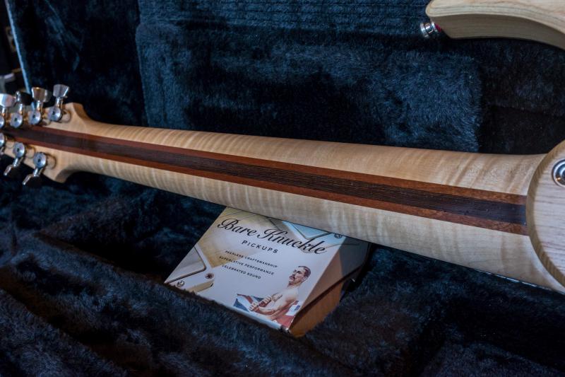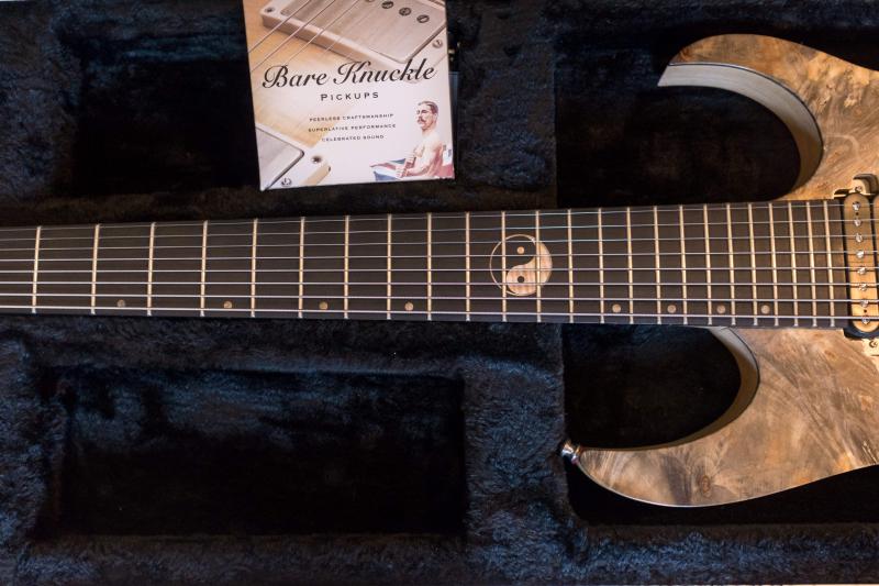 buckeye burl top, swap ash body, 5-piece neck (2x flamed maple, 2x mahogany, 1x wenge) 27" scale, 20" radius, 24 frets, hipshot bridge, 2x BKP aftermath humbucker, custom jin jang inlays on 12. fret