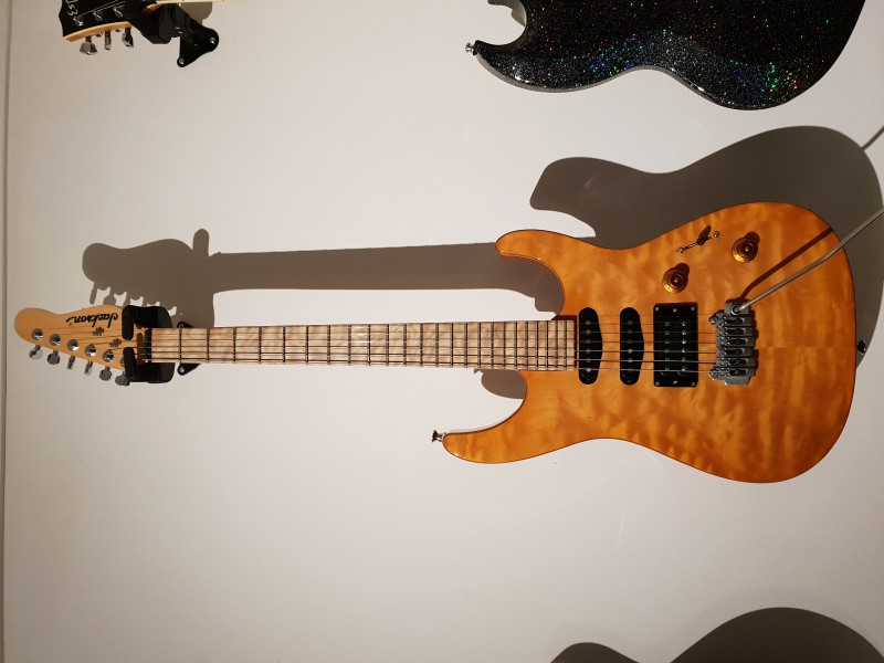 La différence c’est plutôt simple, à la base, ils ont voulu faire un modèle pour ceux qui ne sont pas aficionados du Flyod Rose. En effet la bête est équipée d’un Wilkinson VS50, qui est plus simple en terme de réglage. Autre point de différence que je trouve positif (et étrange pour une signature) c’est qu’ils n’ont pas souhaité barioler la tête avec la signature de Philou. Au niveau lutherie c’est corps Acajou avec un top en Quilted Maple couleur ’Transparent Amber’ et le manche c’est un Maple avec une touche en Quilted Maple (si si!). Config simple en HSS, pas de sustainiac ou autre.
