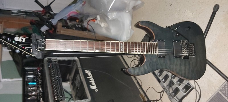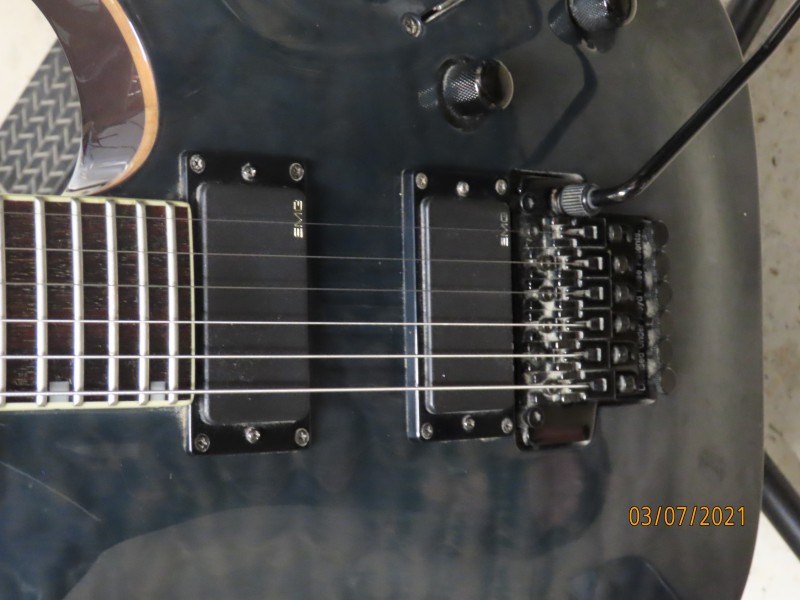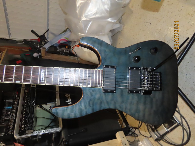 Corps Acajou, Table en érable ondé-manche conducteur en érable 3 pièces-touches palissandre 24 cases-Frettes Jumbo-Binding sur le corps ,le manche et la tête-1 micro EMG 81 et un EMG 85 en manche- Électronique active-1 volume + 1 Tonalité-Sélecteur 3 positions-Vibrato floyd Rose sous licence -Mécanique à bain d 'huile- Couleur bleu mais c est très sobre avec des reflets ondulés, très dur à voir en photo.