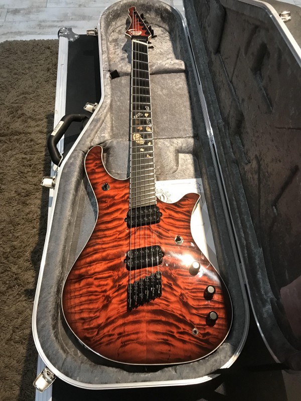 Bonjour à tous, je me sépare de ma magnifique guitare du luthier italien overload guitar, guitare Première main de 2017. Corp en acajou, table en érable ondée « master grade », manche traversant 7pli, touche en ébène, frettes inox, micros bareknuckles aftermath + piezzo activable par un switch, leds dans le manche, double diapason 25,5 - 27, mécaniques autobloquantes, bref une guitare bourrée d options, la même guitare chez mayones ou skervesen coûterait le double, livrée en flycase hiscox, je cherche surtout à la vendre sauf contre une esp horizon 3 red, une vigier excalibur custom ou une mayones
