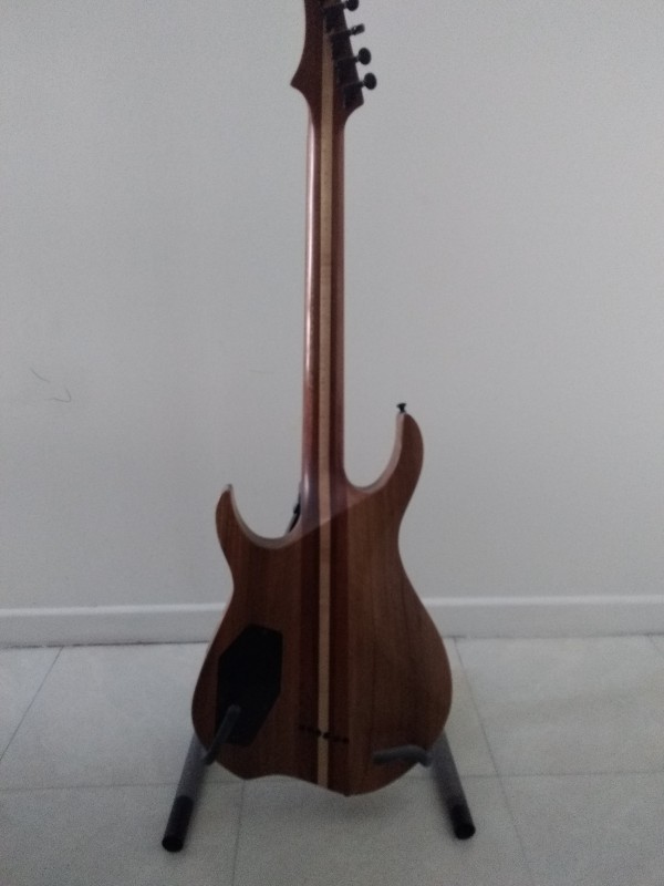 Le noyer apporte du sustain de l'aigu et de la précision et la rondeur quand a elle ,et surtout en partie du a l'érable de la table et le manche qui est constitué de 5 pli acajou/noyer us/érable/noyer us/acajou ,la touche est quand a elle en ébène de macassar ,ca apporte de l'harmonique sustain et chaleur.