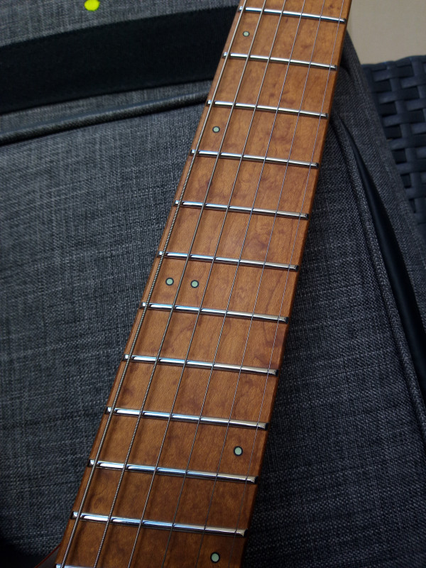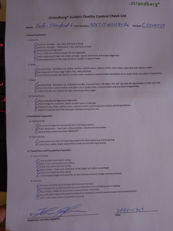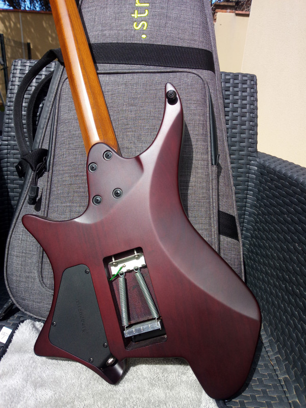 C'est un modèle "Refurb", c'est à dire renvoyé chez Strandberg par un premier acheteur parce que l'instrument ne lui a pas convenu ou qu'il a trouvé des défauts, ou encore que l'instrument neuf présentait des défauts et a été directement classé comme tel. En somme c'est un modèle en très bon état mais pas parfait.