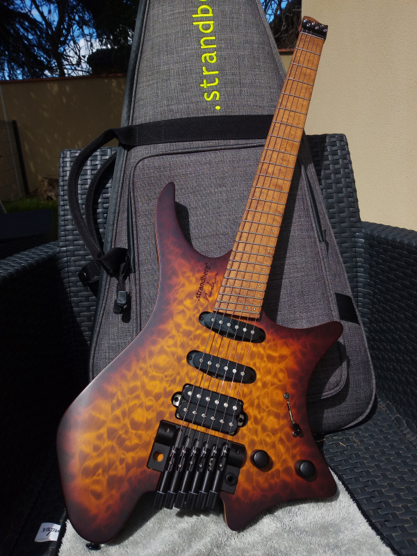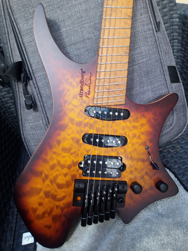Strandberg Boden Standard 6 Tremolo Maple Quilt Bengal Burst. Je l'ai acheté l'été dernier durant une hype Plini et voulais tester cet instrument. Bien qu'elle soit très agréable à jouer et vraiment légère, je préfère jouer avec mes guitares "normales". Et j'ai déjà trop de pelles dans ma collection, autant la laisser à un propriétaire qui saura plus l'apprécier que moi.