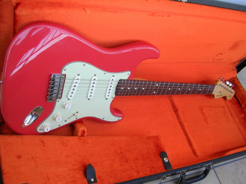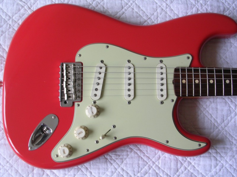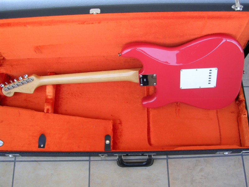 Couleur Fiesta Red très réussie et pickguar light Green, touche palissandre radius 7.25", poids 3,6kg.