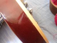 elle est en assez bon etat pour l'année, c'est une guitare avec laquelle j'ai fait pas mal de concerts mais son etat est le meme que quand je l'aie achetée a sushi! a savoir : deux petits pets sur la table plus les griffures de médiator (rien de bien méchant!) , deux pets sur la tranche, enfin je dirais plutot que c'est la peinture qui a tendance a se barrer aux alentours du binding (voir photos) , les traditionelles marques de ceinture au dos de la guitare et pour finir, l'incrustation gibson de la tete marque un leger décollement du vernis, aparament ce defaut est largement connu des utilisateurs, perso je ne connaissait pas mais ce n'est pas vraiment genant visuellement!
