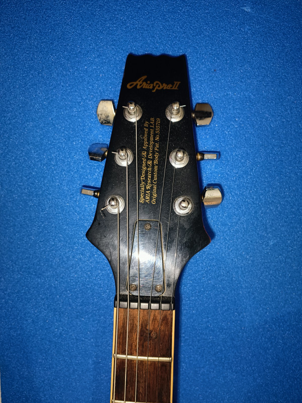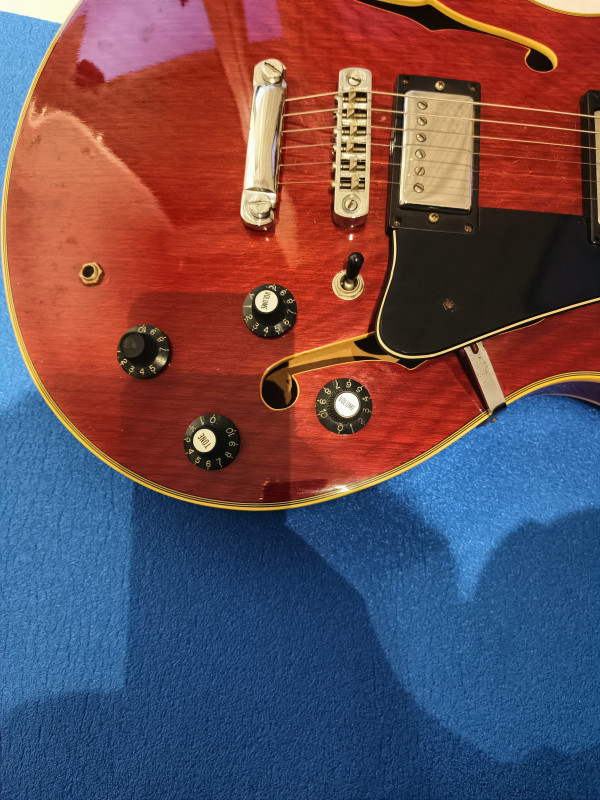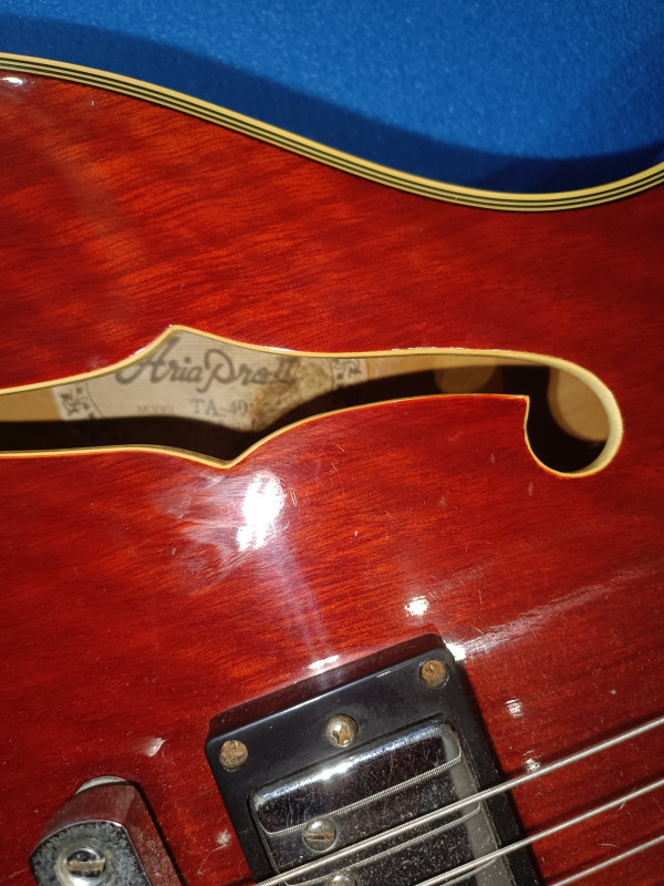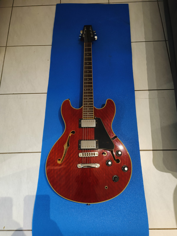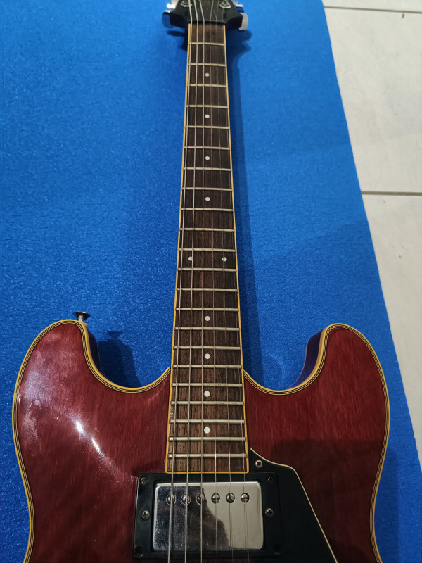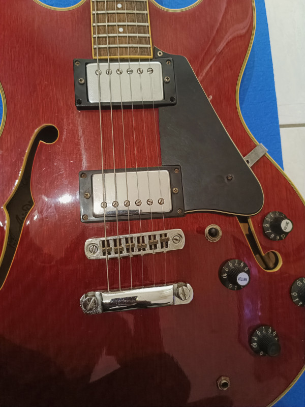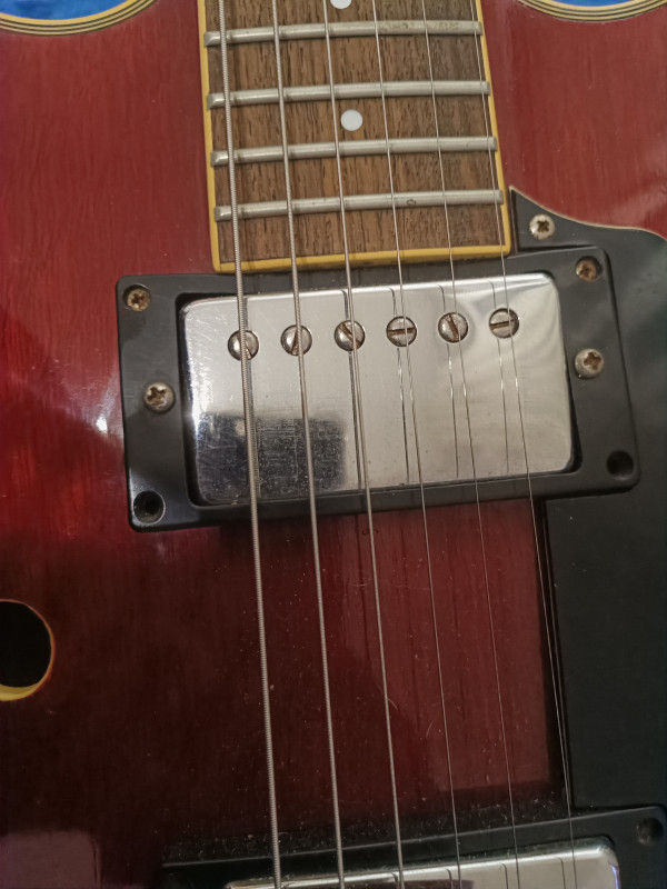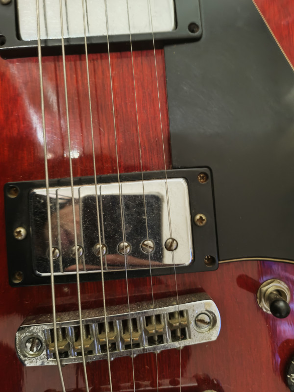 Il y a des raisons à ça : je l'avais remisée dans un étui souple en nylon dans une penderie et un jour je constate que l'étui est devenu gris ! En y regardant de plus près, l'étui avait pris l'humidité de l'appartement voisin qui a suinté à travers le placo... Guitare apparement intacte, l'étiquette à l'intérieur de la caisse est à moitié effacée par la moisissure, on ne voit plus le numéro de série, mais à part ça, le bois n'a pas travaillé, et le vernis est impeccable pas une rayure nulle part, les fretes sont neuves, changées par un luthier, seules trois vis des supports micro et l'écrou de la prise du jack ont de l'oxydation, la plaque du manche indique 8061463 comme numéro de série. Grâce aux sachets de silica que j'ai glissé partout dans l'étui, l'odeur de moisi a disparu. Elle a juste un problème qu'elle a toujours eu : quelques notes qui ne sonnent pas bien (et pas juste) vers la 20ème case au niveau des cordes trois et quatre. la partie électrique n'a pas été et ne sera pas testée, faute d'ampli. il manque aussi un autocollant "tone" sur une tête de potar. Un autre truc qui n'aide pas à se décider : je refuse de l'envoyer car je n'y vois que le risque de la détruire. Elle reste néanmoins plutôt belle, brillante de tous ses chromes... Je l'aurais bien gardé mais j'ai besoin de la somme que la vente pourrait me rapporter et je voudrais éviter qu'elle finisse en déco au mur d'un boui-boui pour bobos... C'est une de mes dernières volontés, pour tout dire... Alors soyez pas trop durs avec moi, je vous prends pas pour des commissaires priseurs, ça reste une occasion de parler de ce qu'on aime et de me dire quoi faire pour lui rendre son meilleur aspect, photos disponibles sur demandes. j'espère quelques réponses, une estimation ou une offre sérieuse, c'est à vous....