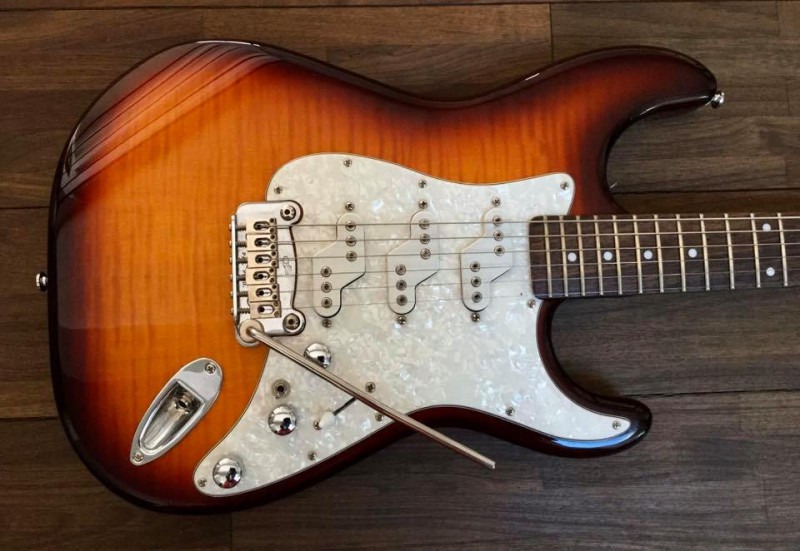 Table en érable flammé corps en acajou manche érable touche palissandre. elle fait parti des premier modèles en tribute et la qualité est vraiment top, tant au niveau du son que de la finition. Accastillage et micros identiques aux modèles US.