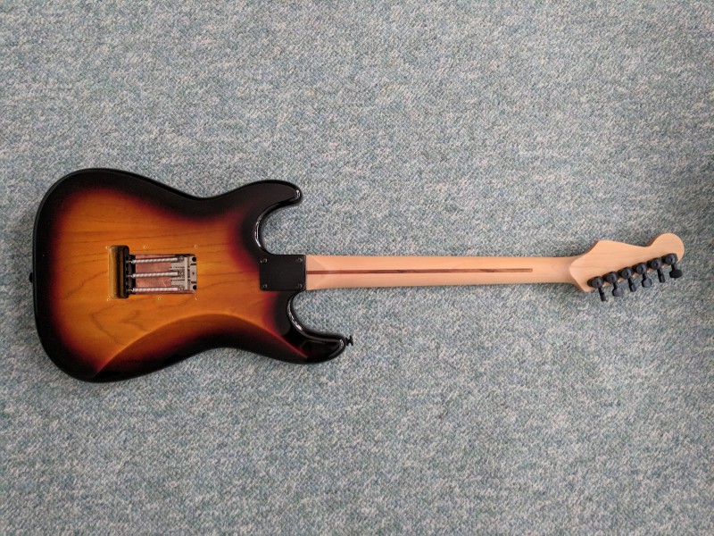 Manche érable, corps frêne des marais avec placage érable ondé, tout deux de marque Mighty Mite - marque américaine de pièces "aftermarket" agrées Fender, fabriquées en Corée dans les usines Cort.