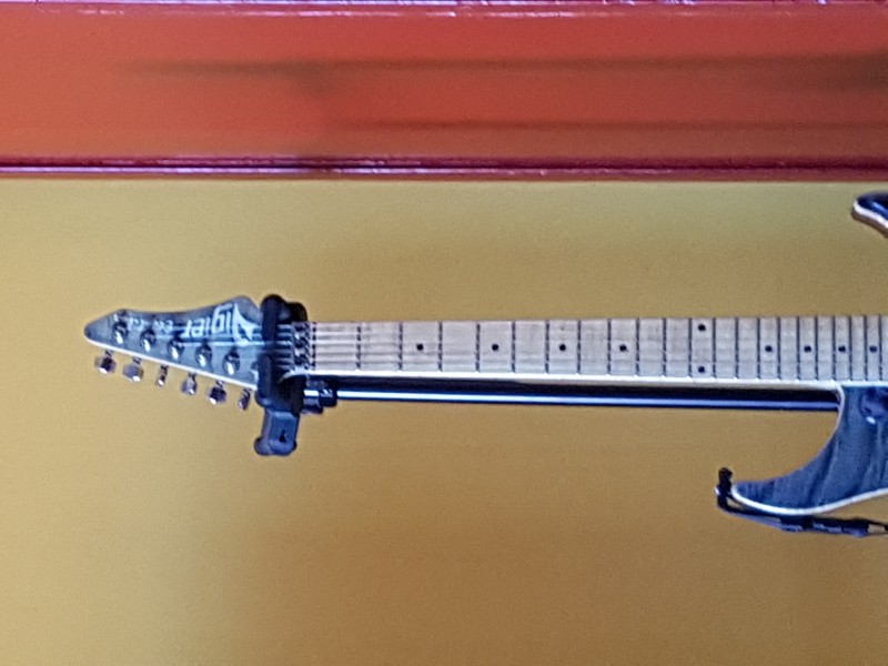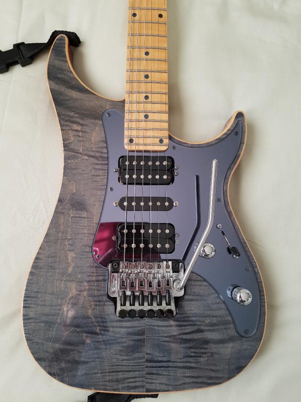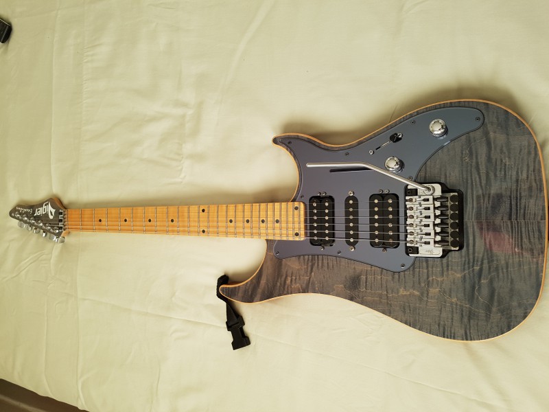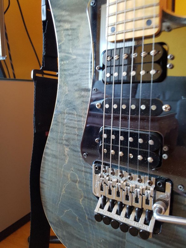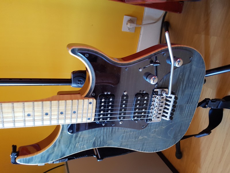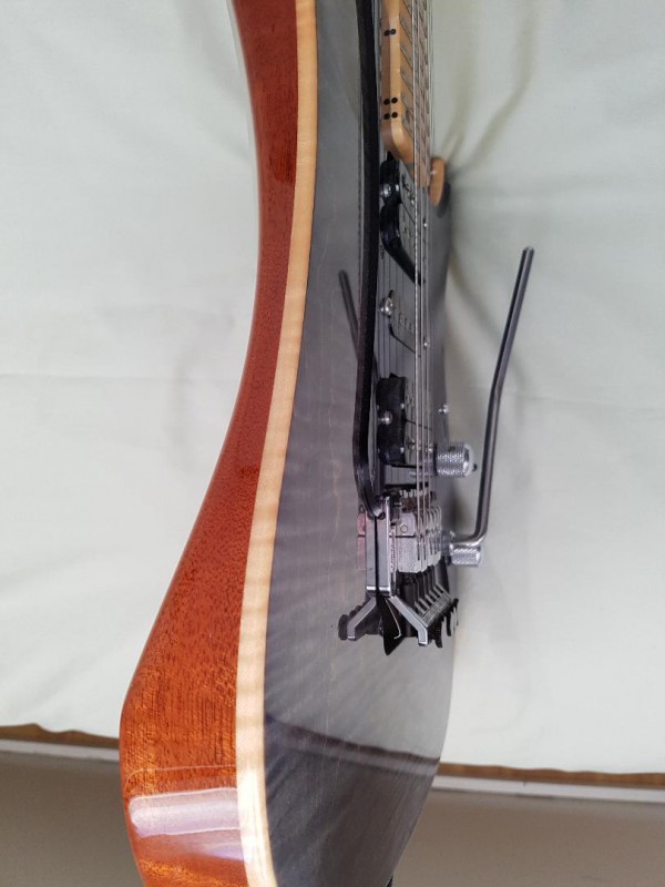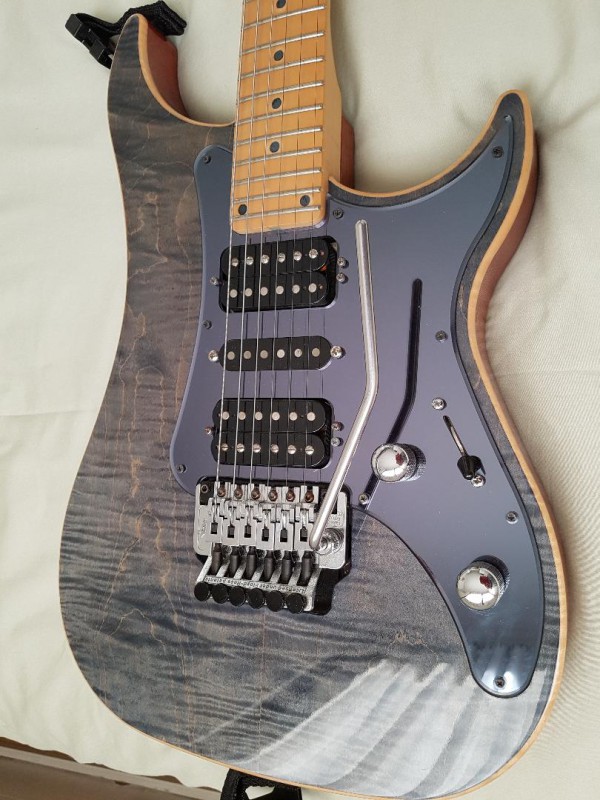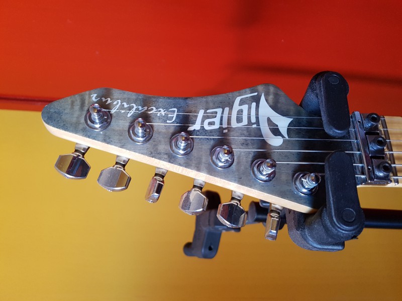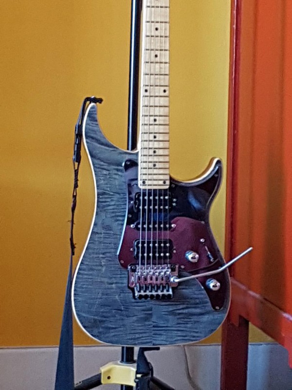 Vigier Excalibur custom unique. C'est une commande spéciale avec un corps en acajou brut et verni. La finition est transparente sur l'acajou. Je ne pense pas qu'il y en ait beaucoup avec un corps acajou j'en ai jamais vu perso. Du vrai custom shop. Rien que la couleur Light Sapphire du verni est une option à 500 ou 600 €. Suivant la lumière la guitare devient bleue, grise ou couleur "Jean" Denim.