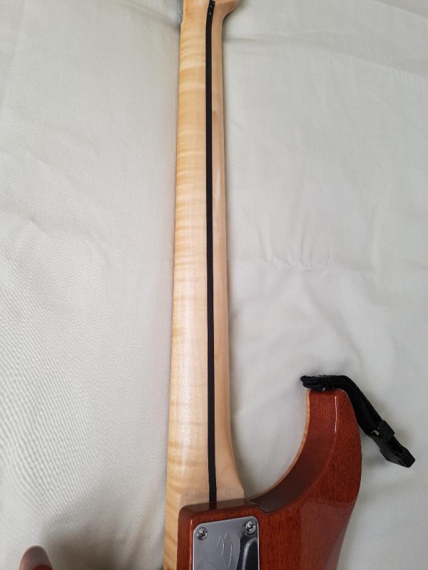 Table en érable, manche également en érable légèrement vernis qui n'accroche pas et tête assortie