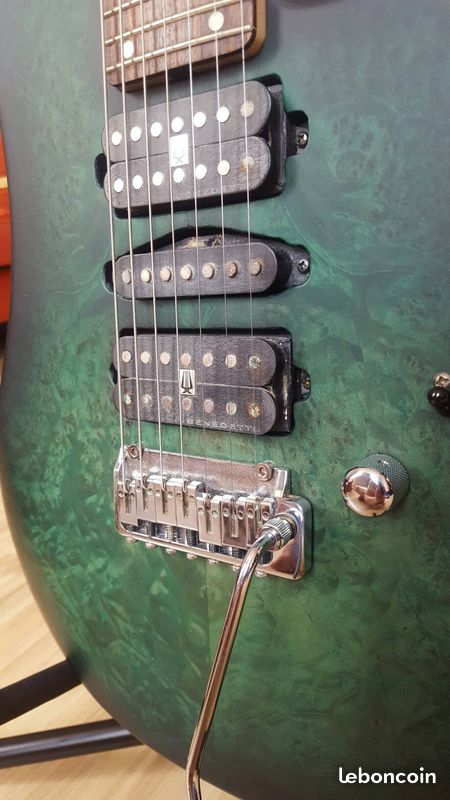 Refretage complet, nouvelle finition avec plaquage à la loupe de peuplier de l'avant, et burst green tête et back. Retape complète du cablage, installation d'un push pull pour spliter les micros double en simple, et d'un killpot (potard avec fonction killswitch). Une petite fêlure derrière la tête sans aucune incidence et qui d'après les artistes de wild n'évoluera pas.