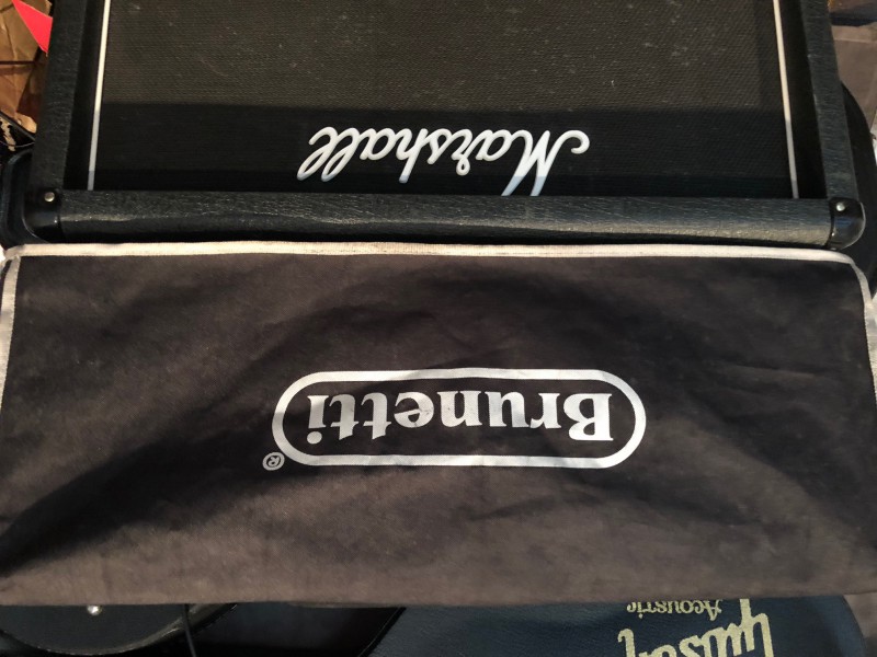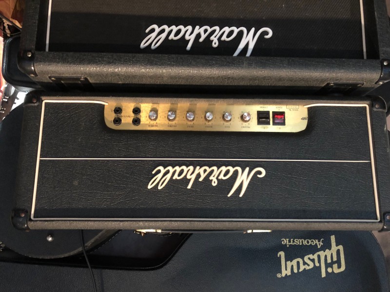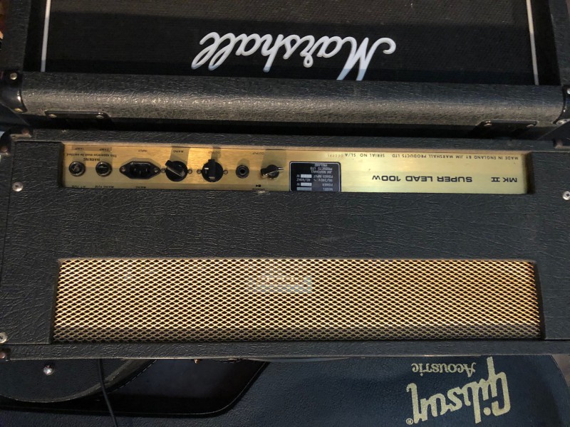 Une tête Marshall JMP Super Lead 100w MK II Plexi 59 de 1979. La bête a reçu une modification par un technicien en Belgique (Manu Burnedskin ou Manulonch sur ce forum), technicien hors pair, il a ajouté un master volume car il faut avouer que sans cela, la bête est clairement injouable en appart ou en répète tellement c’est puissant.