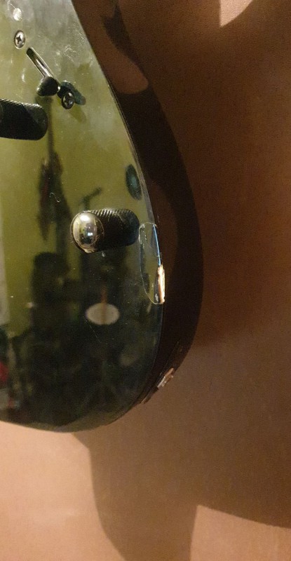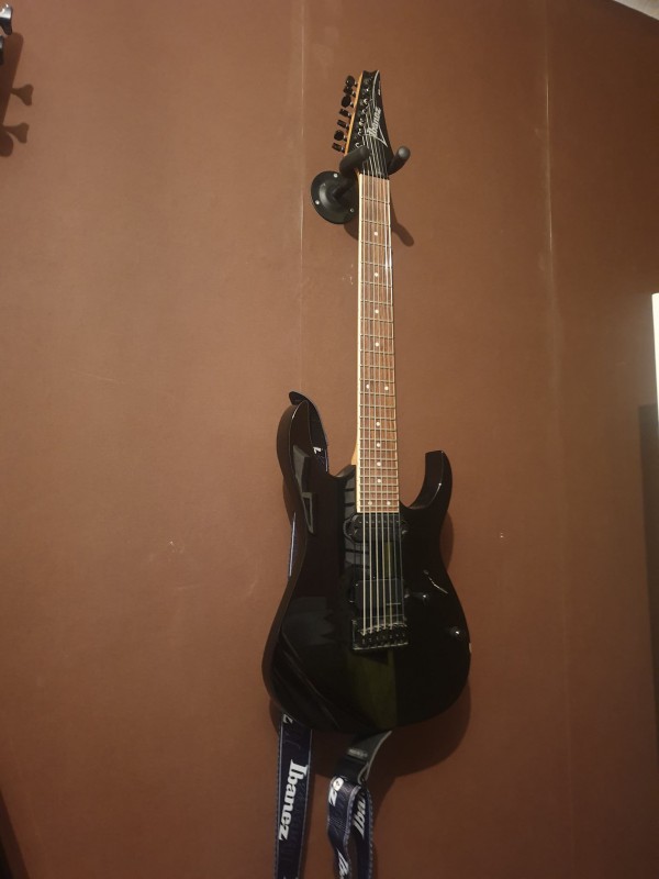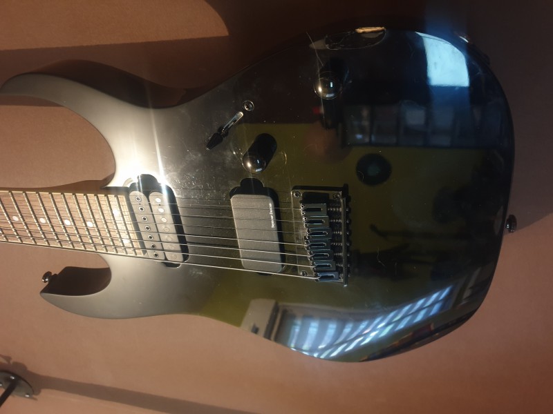 Une Ibanez RG 7321, montée avec un micro chevalet Seymour Duncan Blackout, accompagnée de sa sangle Ibanez et d’une housse de transport. La guitare est en bon état, a été achetée en septembre 2009 neuve. Elle a malheureusement un petit poc sur l’avant de la guitare (voir en photo)