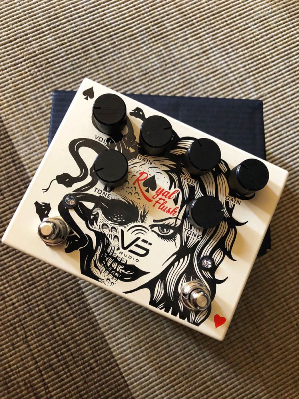 Royal Flush is a dual channel overdrive with separate controls for each channel. The first channel is a low gain overdrive and is designed to create tube amp “early break-up” overdrive for rhythm tone with tone clarity. Second channel is a medium gain overdrive and is designed to capture creamy and rich sound of an amp-like distortion crunch. Both channels engaged emulate a more aggressive cranked tube amp sound with tons of sustain.