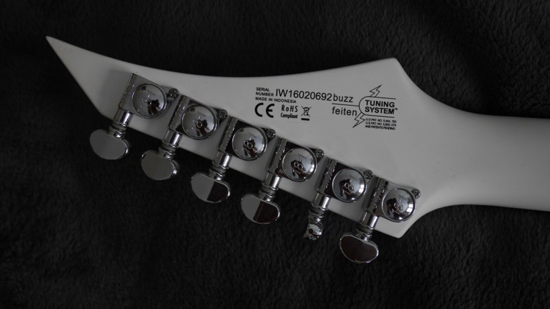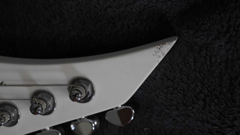 C'est une première main, achetée chez Metal Guitar à Pigalle en 2016, l'ensemble est super propre, les frettes non marquées, peu de traces de jeu, elle aurait été parfaite si le chat n'avait pas décidé de mordiller le bout de la tête quelques jours (évidemment) après qu'elle ait achetée... (cf photo).