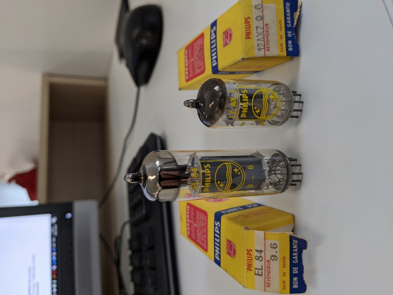 - NOS JAN GE WA triée avec gain de 100: superbe en V1 du Rockmaster. Le son est plein, riche, toutes les fréquences sont là. En V2 elle a tendance à être un peu bruyante. J'en ai mise une 2e en V4 (l'une des triodes gère l'égalisation active de la satu).