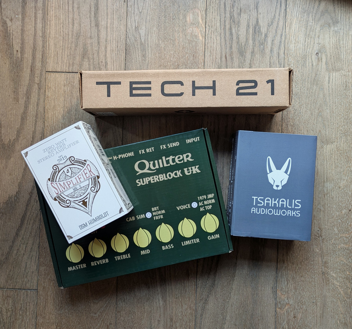 Ce soir, je me fait une petite config sono dans le salon pour commencer à tester. A première vu, j'aime beaucoup le Simplifier, qui propose tout un tas d'options (ground lift, eq, boucle, reverb) le tout dans un format minuscule, et alimenté en 9v.