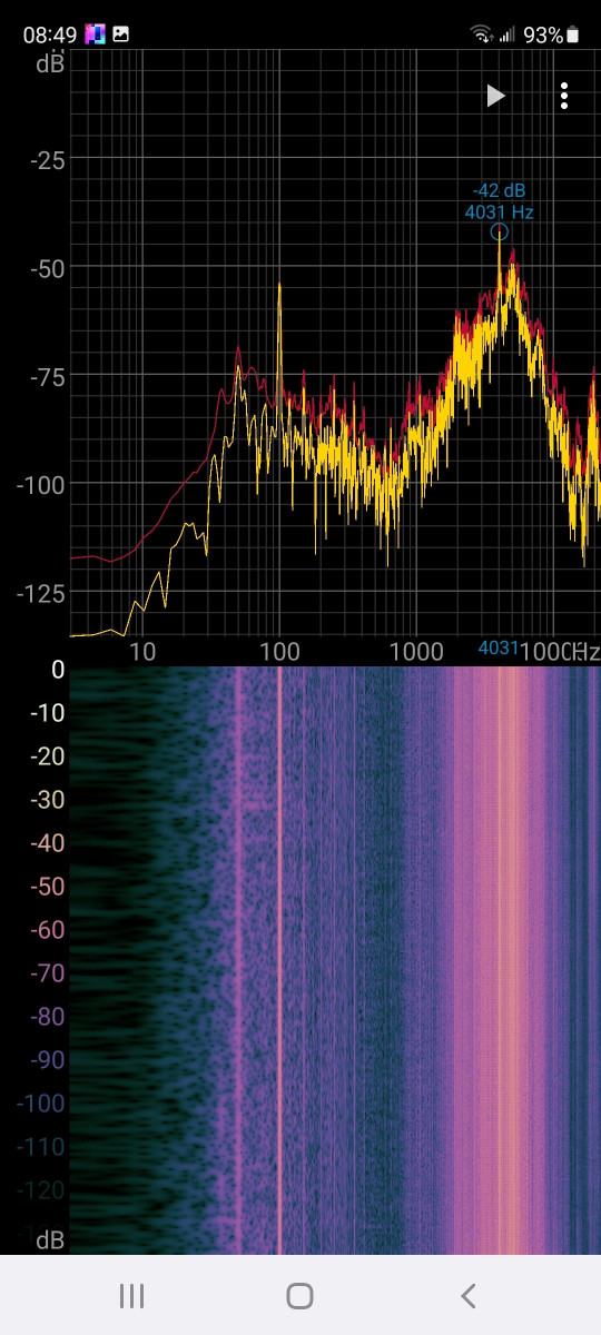 Oui, j'ai deux fréquences problématiques : une à 100Hz sans doute une harmonique de la fréquence secteur et une à 4031 Hz qui bave en dessus et en dessous. Voici le bruit de fond audio généré par l’ampli à vide :
