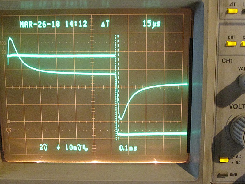 ! Merci d'avoir fait cette capture! 15 microsecondes, non, probablement pas audible, mais on voit bien que l'attaque est déformée (et avec une réponse typique d'un système amorti!). Dis-moi, tu l'as un peu poussé, ton ampli, pour faire la manip? Et ton signal carré, il était à quelle fréquence? Il vaudrait mieux rester dans la plage de la guitare, soit de 80 Hz à 1 kHz environ, plutôt dans les médiums entre 200 et 400 Hz.