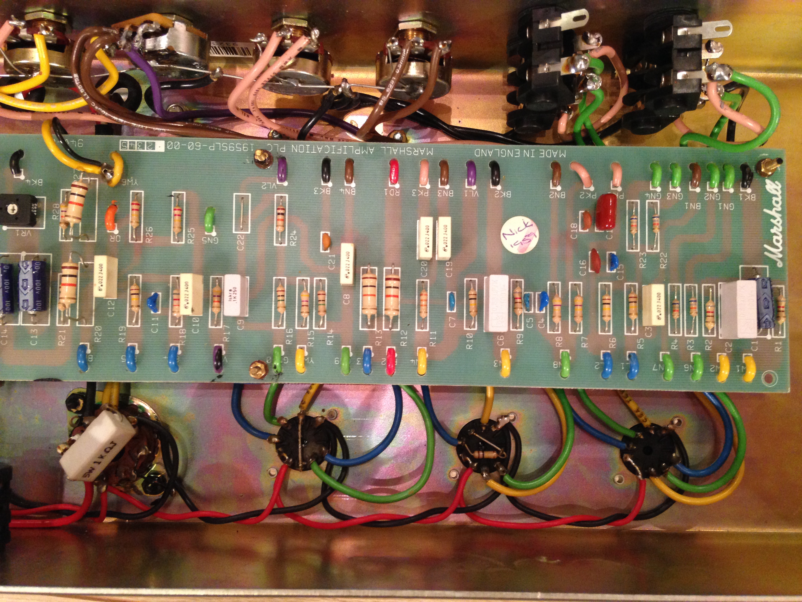 Offered is an all original dated 11/72 Super Lead Marshall with it's original vinyl cover. This one is in very nice shape and was used moderately and then stored for a number of years. When I found this recently I was amazed to find that it looks to be essentially untouched circuit wise down to the yellow wax top British Dublier caps and Mullard EL34 tubes. This is probably the purest to the original sound of 1972 as you are likely to find. Most I have seen have either been modded, had some or all of the capacitors changed, and various tube compliments installed. Since this amp had not been on for awhile I brought the amp up slowly on my voltage variac to reform the capacitors. I also sprayed out the pots with contact cleaner and had a look at the solder joints and all appears to be in nice original condition. "Trudy" did a good job assembling this one! It appears one tube socket was changed and other than that it looks like it has remained the same since new. The power cord and plug are original. I decided to leave it as it is for the next owner to change or keep the same. The tolex has marks and wear to the corners, and one spot on top where something hot melted a circular spot. The logo is missing one of the "L's" as shown in the pics. The handle is in good shape, there is a bit of corrosion on the gold metal mounts. The sound is what you would expect from a point to point wired classic Marshall. It's a sweet one and sounds phenomenal! I will pack this amp extremely well for a safe transit. I have shipped many fragile high end audio and music equipment pieces and I make sure it arrives as it is shown. Due to age this amp will be sold as is.