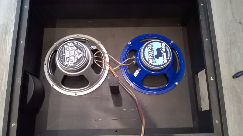 Lassé du rendu des V30 dans le 2x12 oversized (je joue sur une tête 65amps Producer et plus récemment sur une Orange CS50), j'ai décidé de passer sur des HP Weber.