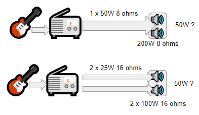 2) je branche les deux canaux indépendants de l'ampli sur les deux entrées du 2x12 alors en stéreo 16 Ohms (max 2x100W) donc j'obtiens 2x25W=50W.