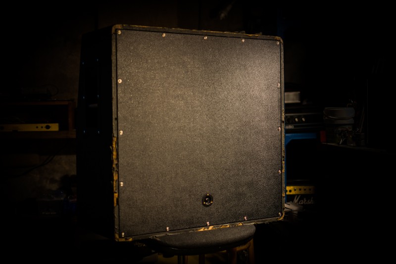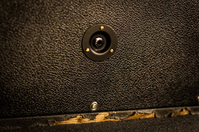 En ce qui concerne le cab lui-même, j'ai refait le panneau arrière en CP avec du tolex Marshall (l'original était en agglo et en mauvais état). Le grill cloth est également du Marshall, du "basket weave" que j'ai utilisé pour remplacer le "checker board" d'origine. Pour mieux coller au look 60's j'ai également remplacé le gros logo blanc par un petit logo doré. Au passage j'ai utilisé des vis de bien meilleure qualité que les originales, pour fixer le baffle sur les tasseaux.