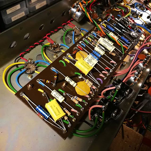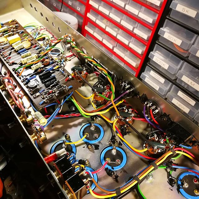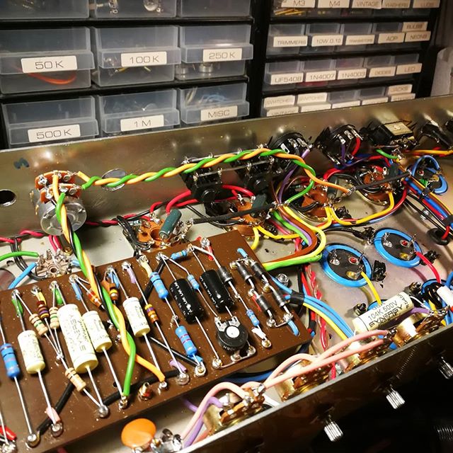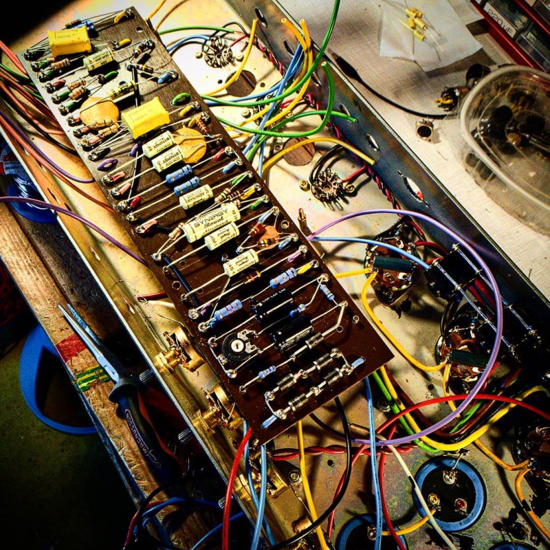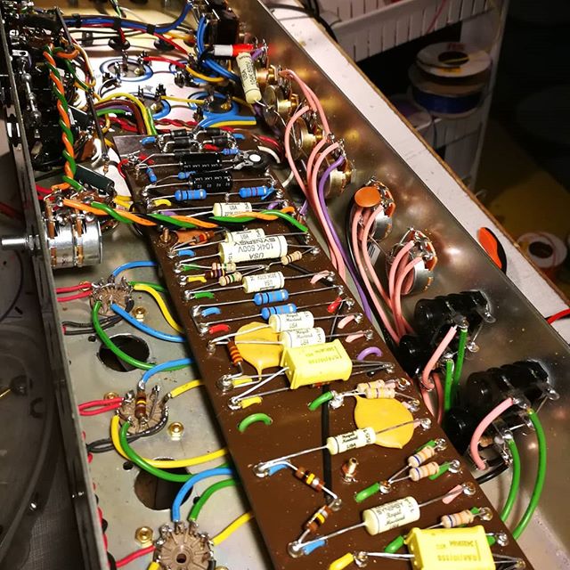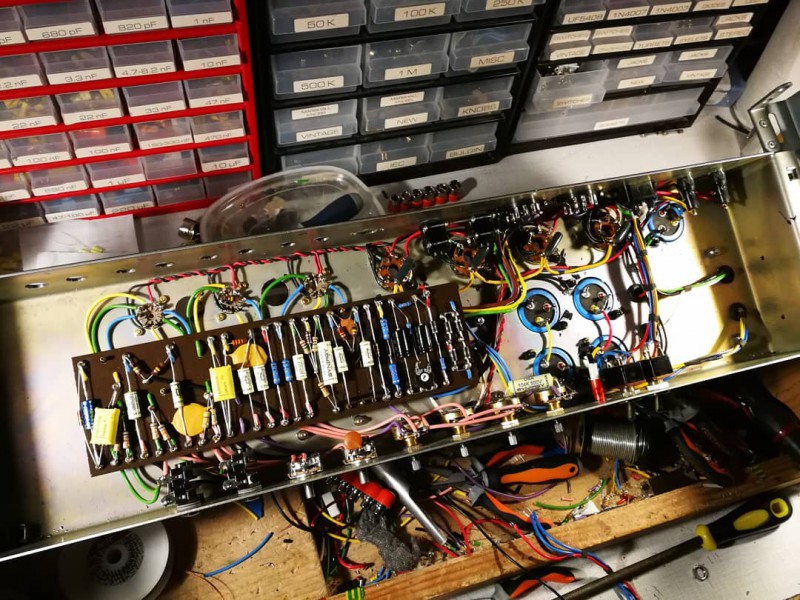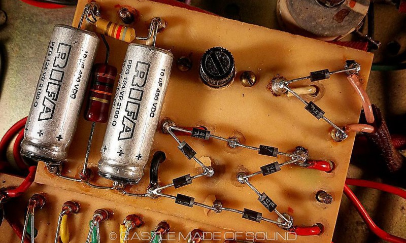 Les condensateurs de filtrage et bias ont été remplacés (JJ, RIFA) ainsi que les diodes et les deux interrupteurs (alim et standby) des résistances de 220R ont été ajoutées sur les écrans (pour mieux protéger les tubes) et une embase IEC a été installée. Tous les autres composants et les transformateurs sont d’origine.