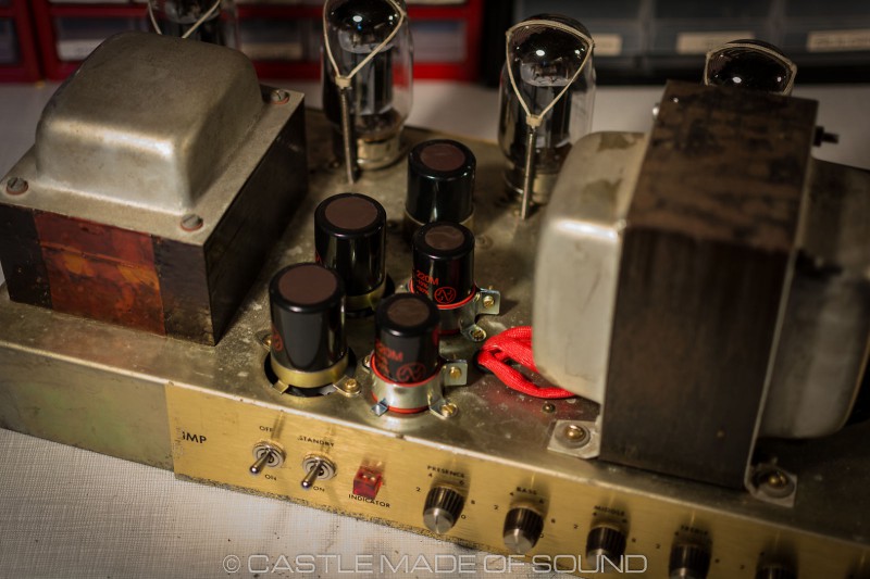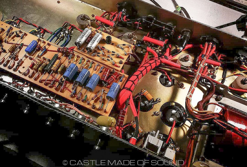 Les condensateurs de filtrage et bias ont été remplacés (JJ, RIFA) ainsi que les diodes et les deux interrupteurs (alim et standby) des résistances de 220R ont été ajoutées sur les écrans (pour mieux protéger les tubes) et une embase IEC a été installée. Tous les autres composants et les transformateurs sont d’origine.