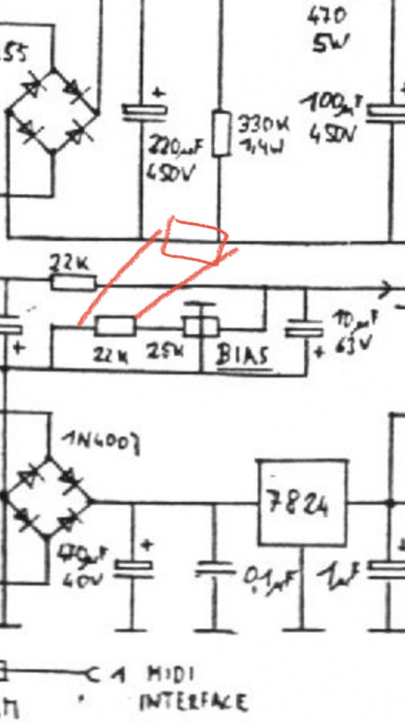 si tu ne peux pas aller au delà de 30mA , effectivement c'est que ta tension de bias doit être trop négative. un peu comme sur les ampli ou tu peux passer de 6L6 à EL34, en passant de -50 à -60V ou -37 à -42 pour les EL34, il y a un switch qui modifie les valeurs de ponts de résistance sur le circuit de bias. peut êtrte pareil dans ce cas, modifier (ou rajouter une résistance en série) le circuit résistif au niveau de la résistance variable (trimer ou potar) réglant la tension de bias. soit jouer sur R110 (augmenter sa valeur en passant à 5,6K), soit jouer sur R111(diminuer sa valeur par exemple en rajoutant une résistance en // genre 100K O) et voir.