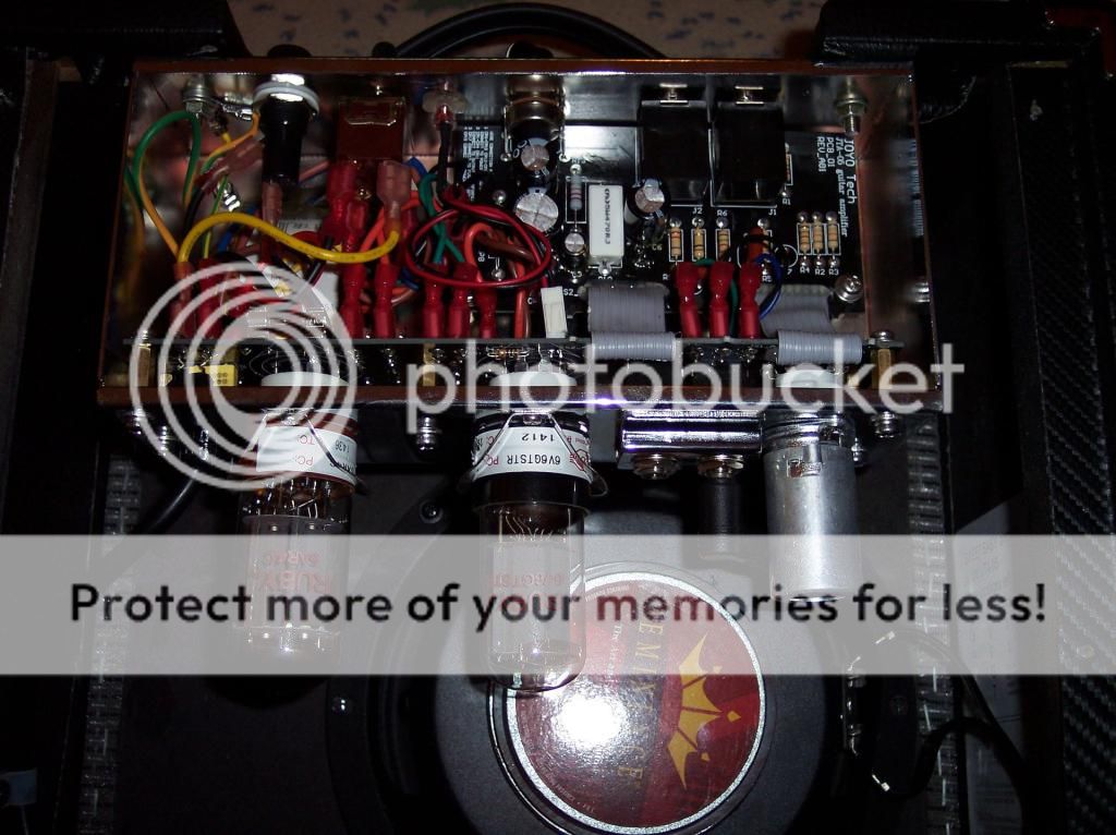Sinon, concernant l'intérieur, ça a l'air correct (pour ce que j'en connais): les lampes sont des Ruby, il y'a bien les deux sorties HP (4 et 8ohms), le tout a l'air propre.